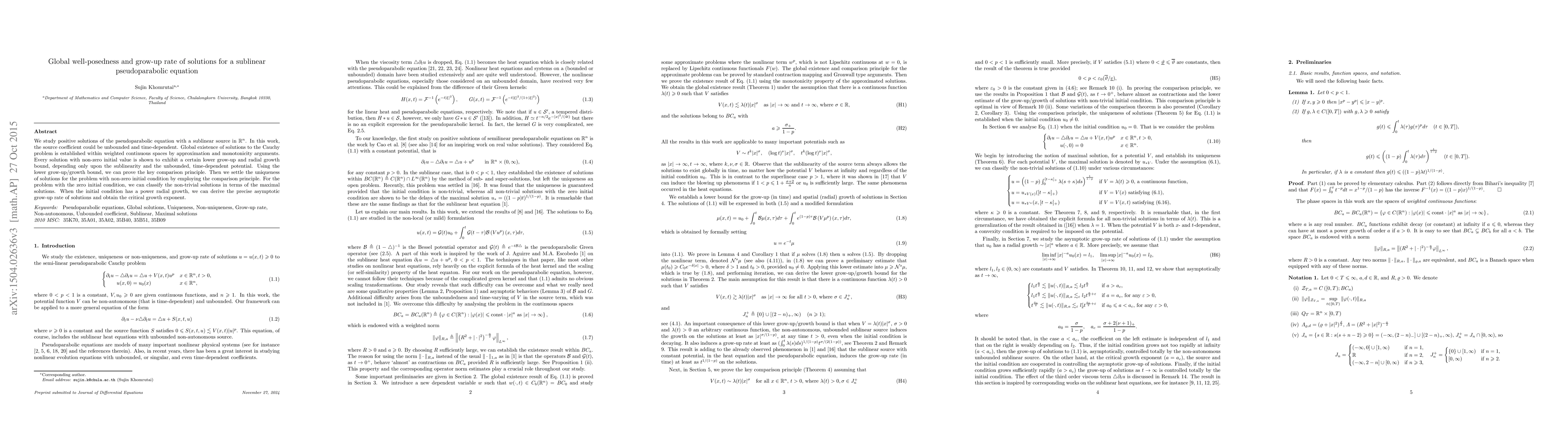 We study positive solutions of the pseudoparabolic equation with a sublinear source in $\mathbb{R}^n$. In this work, the source coefficient could be unbounded and time-dependent. Global existence of solutions to the Cauchy problem is established within weighted continuous spaces by approximation and monotonicity arguments. Every solution with non-zero initial value is shown to exhibit a certain lower grow-up and radial growth bound, depending only upon the sublinearity and the unbounded, time-dependent potential. Using the lower grow-up/growth bound, we can prove the key comparison principle. Then we settle the uniqueness of solutions for the problem with non-zero initial condition by employing the comparison principle. For the problem with the zero initial condition, we can classify the non-trivial solutions in terms of the maximal solutions. When the initial condition has a power radial growth, we can derive the precise asymptotic grow-up rate of solutions and obtain the critical growth exponent.