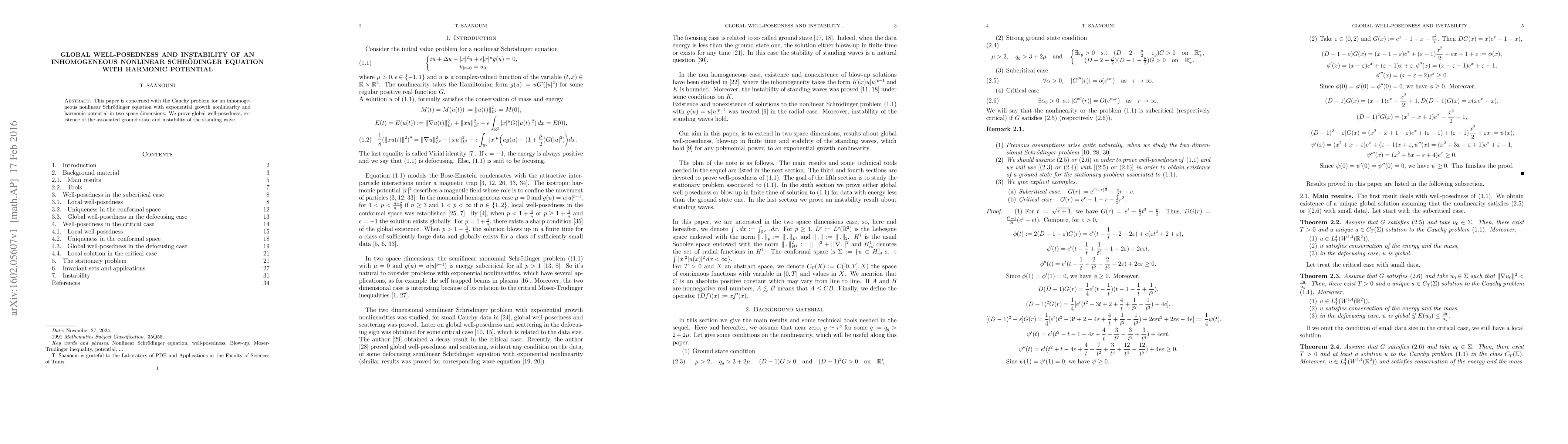 This paper proves global well-posedness for an inhomogeneous nonlinear Schrödinger equation with exponential growth nonlinearity and harmonic potential in two dimensions. It also demonstrates the existence of a ground state and instability of the standing wave solution.