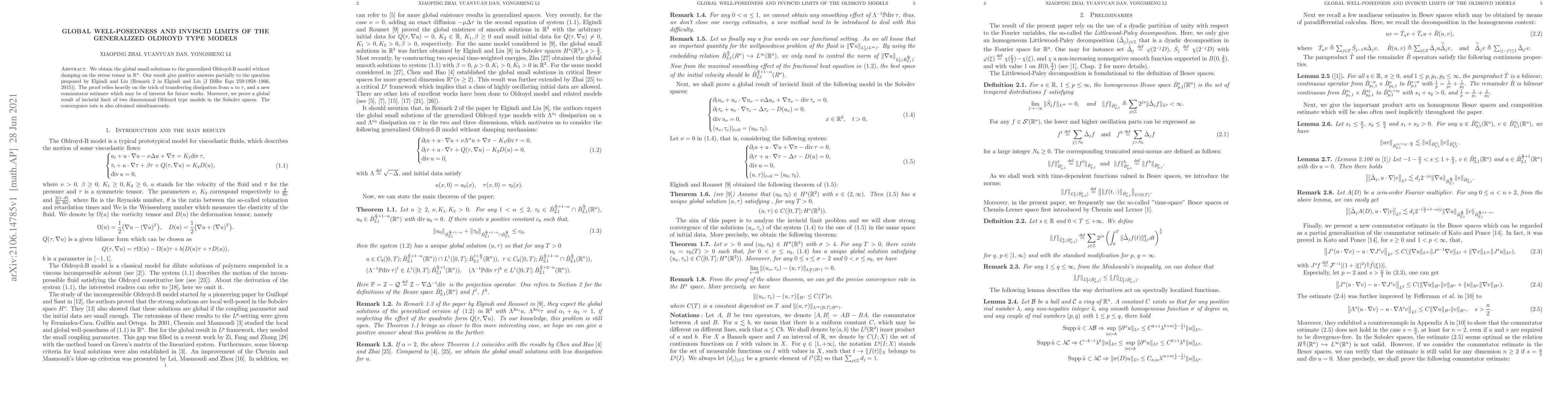 We obtain the global small solutions to the generalized Oldroyd-B model without damping on the stress tensor in $\mathbb{R}^n$. Our result give positive answers partially to the question proposed by Elgindi and Liu (Remark 2 in Elgindi and Liu [J Differ Equ 259:1958--1966, 2015)]. The proof relies heavily on the trick of transferring dissipation from $u$ to $\tau$, and a new commutator estimate which may be of interest for future works. Moreover, we prove a global result of inviscid limit of two dimensional Oldroyd type models in the Sobolev spaces. The convergence rate is also obtained simultaneously.