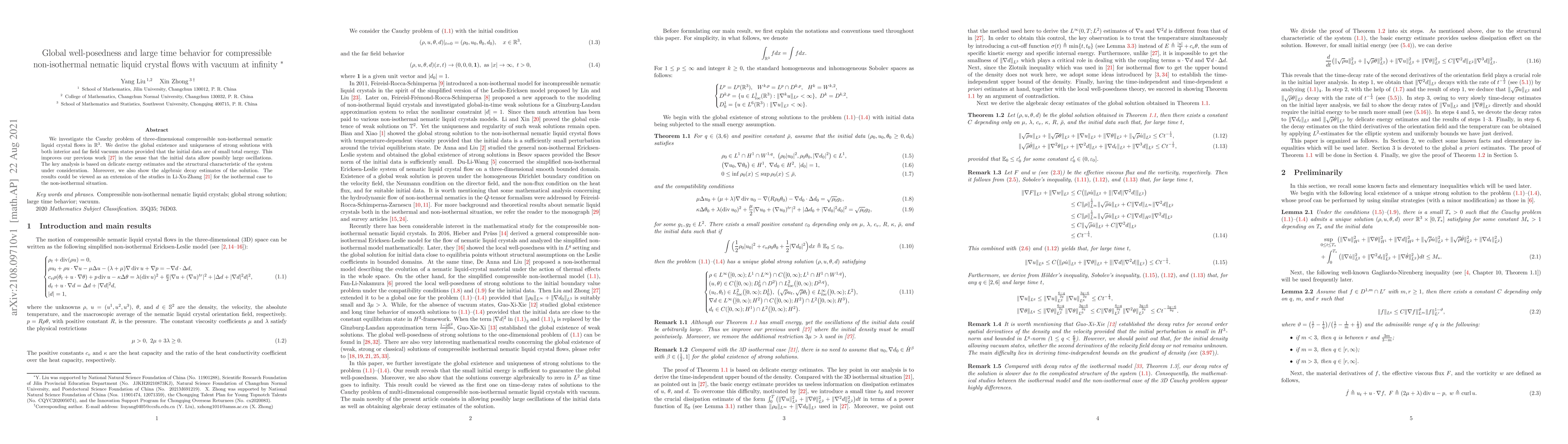 This paper establishes global existence and uniqueness of strong solutions for three-dimensional compressible non-isothermal nematic liquid crystal flows with vacuum states, improving previous work by allowing larger initial data oscillations. The analysis employs energy estimates and structural characteristics to achieve algebraic decay of the solution.