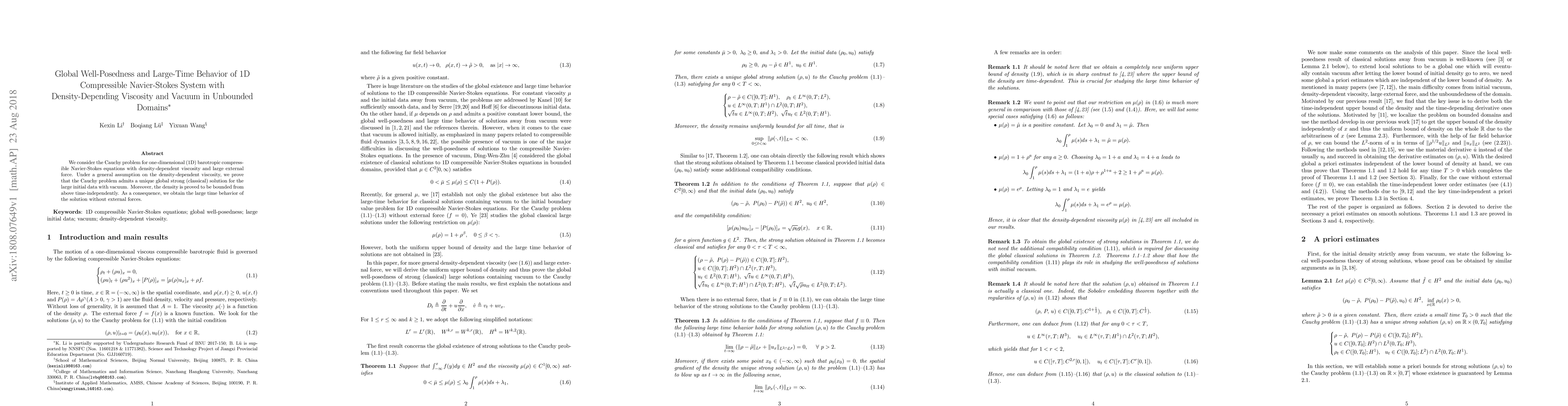 This paper proves global well-posedness and large-time behavior for a 1D compressible Navier-Stokes system with density-dependent viscosity and vacuum, showing the existence of a unique global strong solution and bounded density, along with the solution's behavior as time approaches infinity.