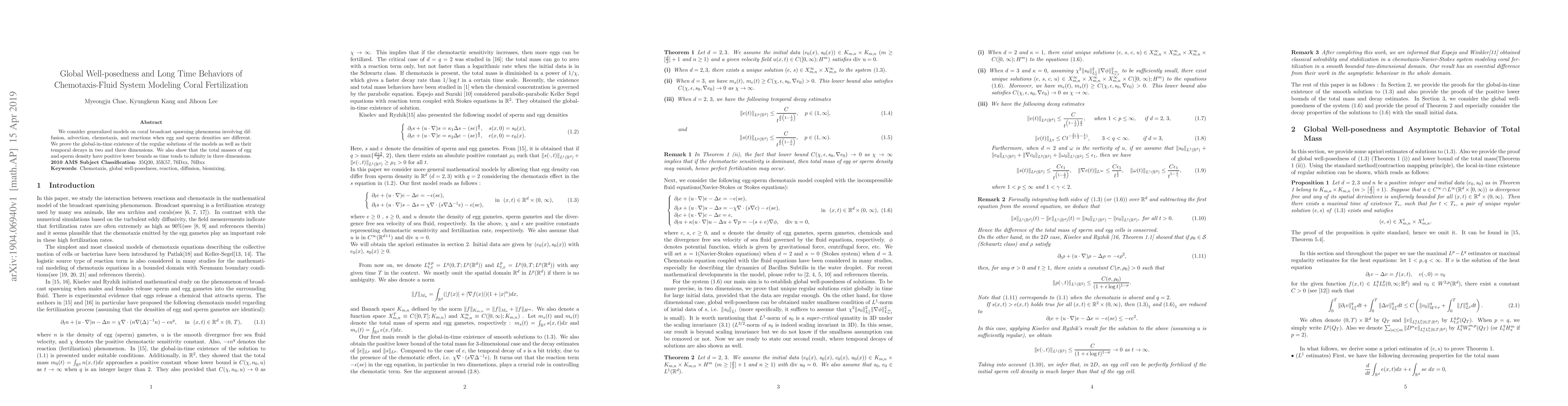 We consider generalized models on coral broadcast spawning phenomena involving diffusion, advection, chemotaxis, and reactions when egg and sperm densities are different. We prove the global-in-time existence of the regular solutions of the models as well as their temporal decays in two and three dimensions. We also show that the total masses of egg and sperm density have positive lower bounds as time tends to infinity in three dimensions.