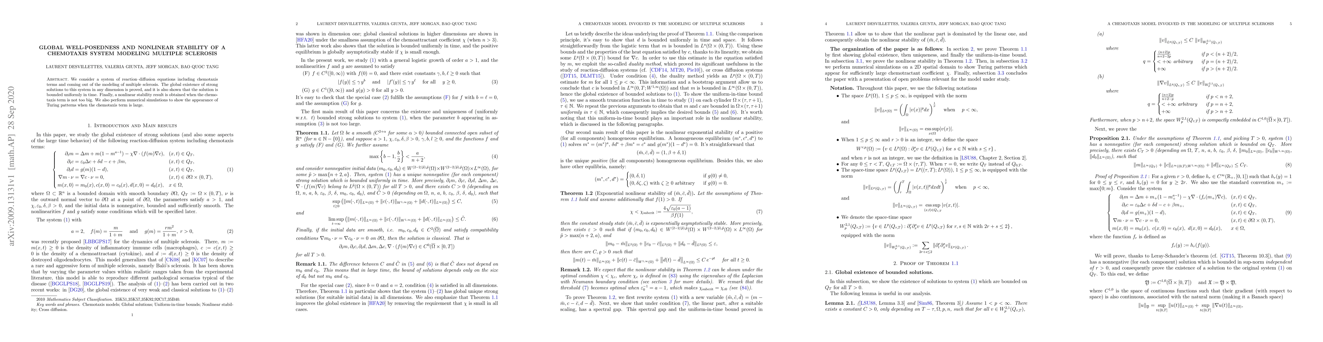 This paper proves global existence and boundedness of strong solutions for a chemotaxis system modeling multiple sclerosis, and establishes nonlinear stability under certain conditions. Numerical simulations reveal the emergence of Turing patterns with significant chemotaxis.