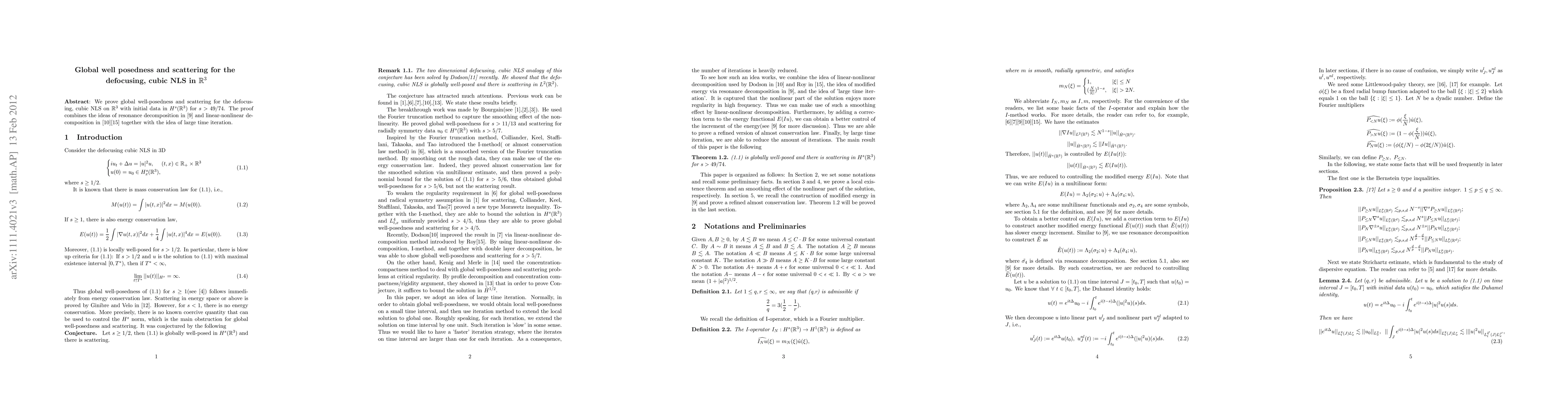 Summary: This paper establishes global well-posedness and scattering for the defocusing cubic NLS in $\mathbb{R}^3$ for initial data in $H^s(\mathbb{R}^3)$ with $s>49/74$, utilizing a combination of resonance decomposition and linear-nonlinear decomposition techniques along with large time iteration.