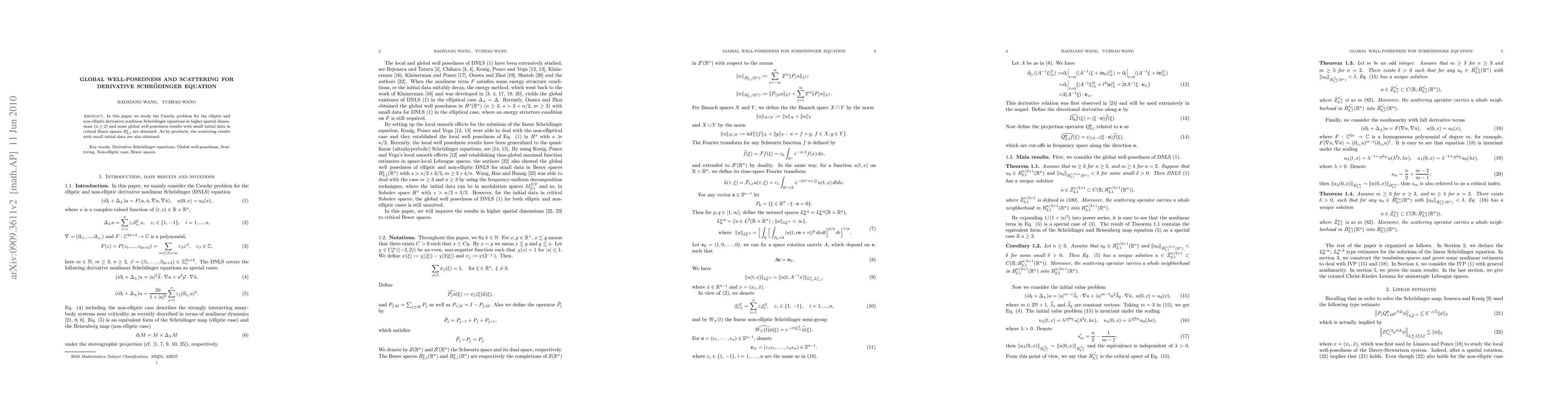 This paper investigates the Cauchy problem for derivative nonlinear Schrödinger equations in higher dimensions, establishing global well-posedness for small initial data in critical Besov spaces, and also provides scattering results for these initial conditions.