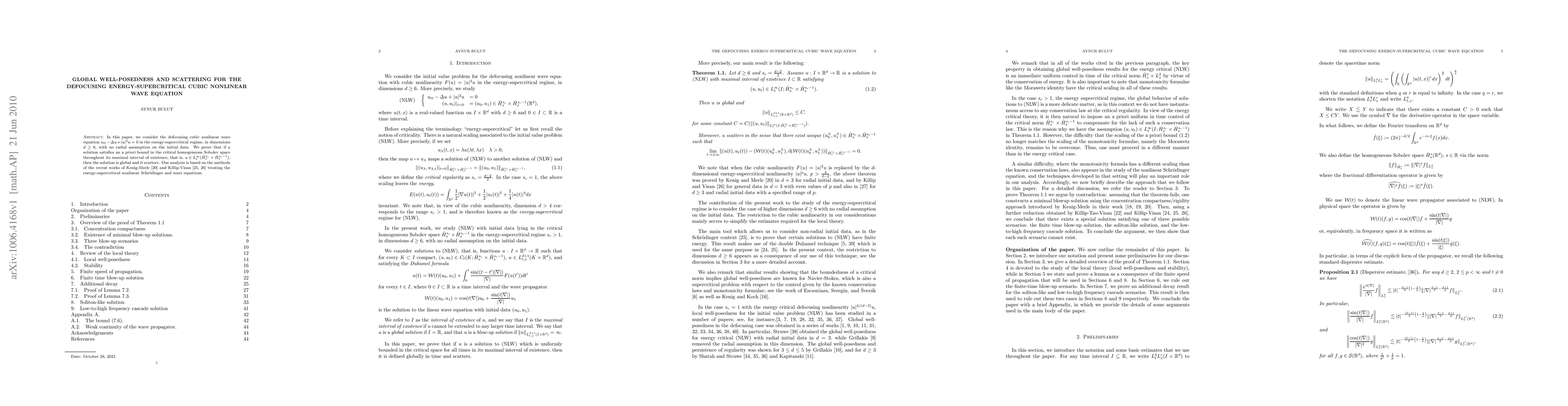 In this paper, we consider the defocusing cubic nonlinear wave equation $u_{tt}-\Delta u+|u|^2u=0$ in the energy-supercritical regime, in dimensions $d\geq 6$, with no radial assumption on the initial data. We prove that if a solution satisfies an a priori bound in the critical homogeneous Sobolev space throughout its maximal interval of existence, that is, $u\in L_t^\infty(\dot{H}_x^{s_c}\times\dot{H}_x^{s_c-1})$, then the solution is global and it scatters. Our analysis is based on the methods of the recent works of Kenig-Merle \cite{KenigMerleSupercritical} and Killip-Visan \cite{KillipVisanSupercriticalNLS,KillipVisanSupercriticalNLW3D} treating the energy-supercritical nonlinear Schr\"odinger and wave equations.