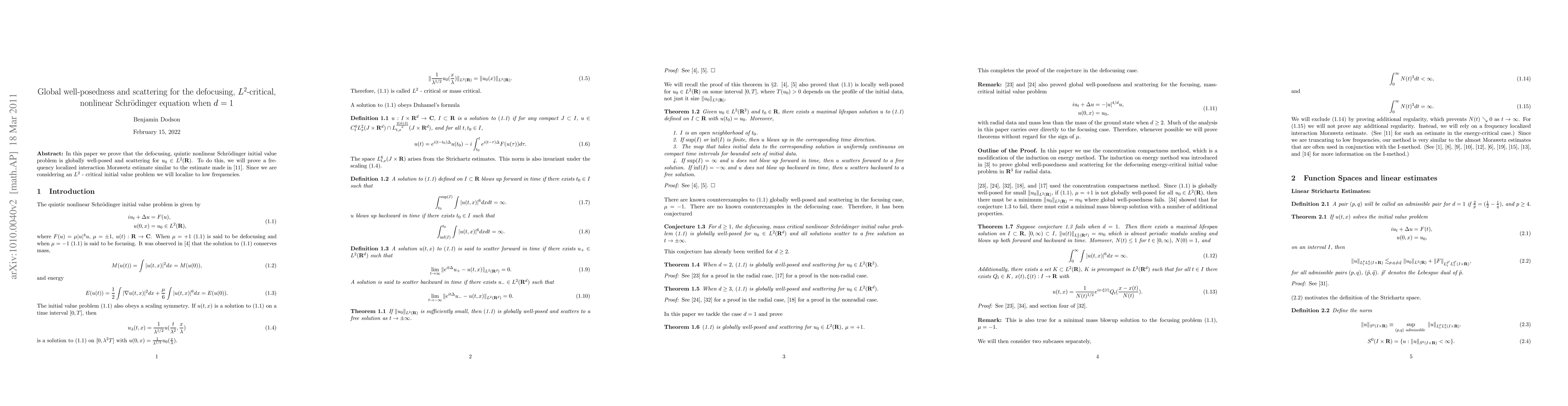 In this paper we prove that the defocusing, quintic nonlinear Schr\"odinger initial value problem is globally well-posed and scattering for $u_{0} \in L^{2}(\mathbf{R})$. To do this, we will prove a frequency localized interaction Morawetz estimate similar to the estimate made in [11]. Since we are considering an $L^{2}$ - critical initial value problem we will localize to low frequencies.