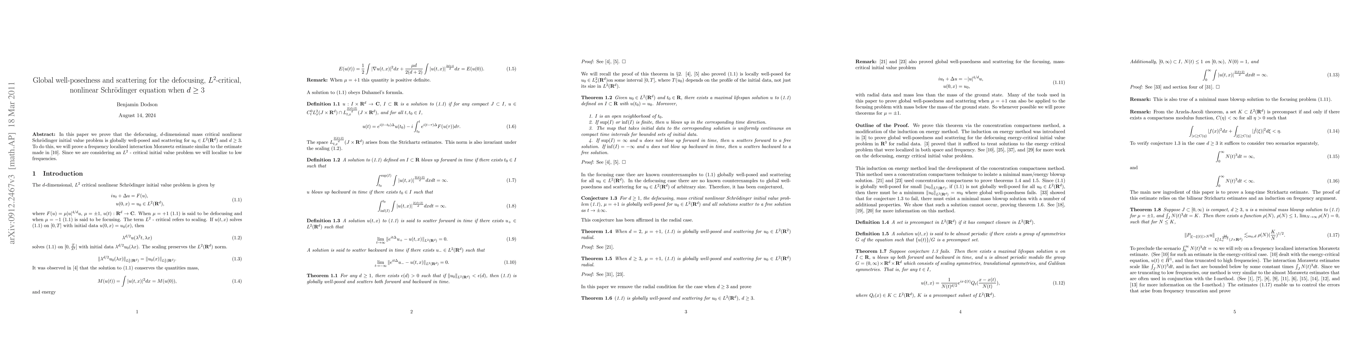 In this paper we prove that the defocusing, $d$-dimensional mass critical nonlinear Schr{\"o}dinger initial value problem is globally well-posed and scattering for $u_{0} \in L^{2}(\mathbf{R}^{d})$ and $d \geq 3$. To do this, we will prove a frequency localized interaction Morawetz estimate similar to the estimate made in [10]. Since we are considering an $L^{2}$ - critical initial value problem we will localize to low frequencies.