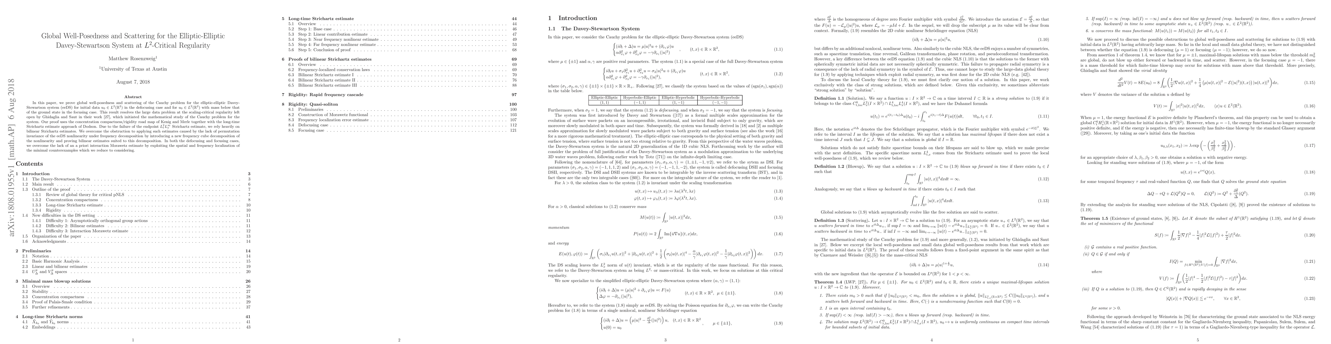 In this paper, we prove global well-posedness and scattering of the Cauchy problem for the elliptic-elliptic Davey-Stewartson system (eeDS) for initial data $u_{0}\in L^{2}(\mathbb{R}^{2})$ in the defocusing case and for $u_{0}\in L^{2}(\mathbb{R}^{2})$ with mass below that of the ground state in the focusing case. This result resolves the large data problem at the scaling-critical regularity left open by Ghidaglia and Saut in their work initiating the mathematical study of the Cauchy problem for the system. Our proof uses the concentration compactness/rigidity road map of Kenig and Merle together with the long-time Strichartz estimate approach of Dodson. Due to the failure of the endpoint $L_{t}^{2}L_{x}^{\infty}$ Strichartz estimate, we rely heavily on bilinear Strichartz estimates. We overcome the obstruction to applying such estimates caused by the lack of permutation invariance of the eeDS nonlinearity under frequency decomposition by introducing a new frequency cube decomposition of the nonlinearity and proving bilinear estimates suited to this decomposition. In both the defocusing and focusing cases, we overcome the lack of an a priori interaction Morawetz estimate by exploiting the spatial and frequency localization of the minimal counterexamples which we reduce to considering.