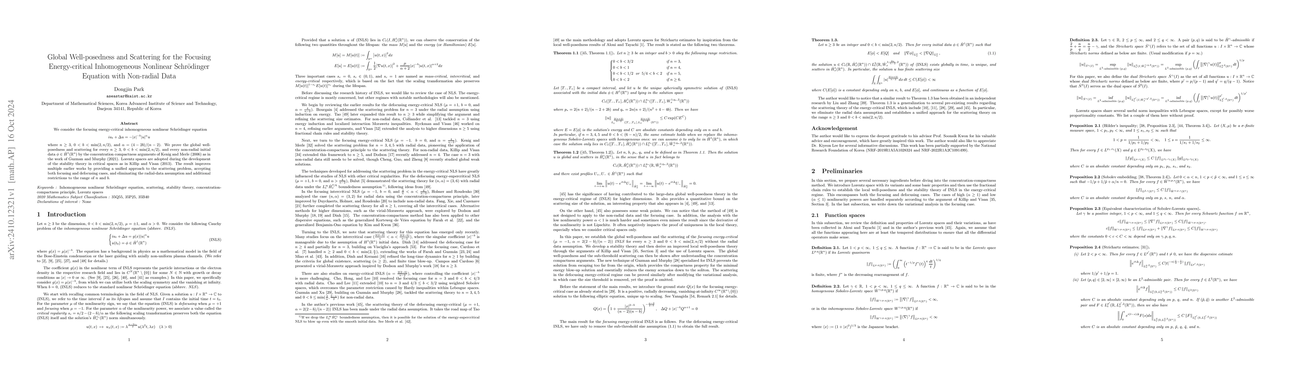 This paper proves global well-posedness and scattering for the focusing energy-critical inhomogeneous nonlinear Schrödinger equation using concentration compactness arguments and Lorentz spaces. It eliminates previous assumptions of radial data and specific parameter restrictions.