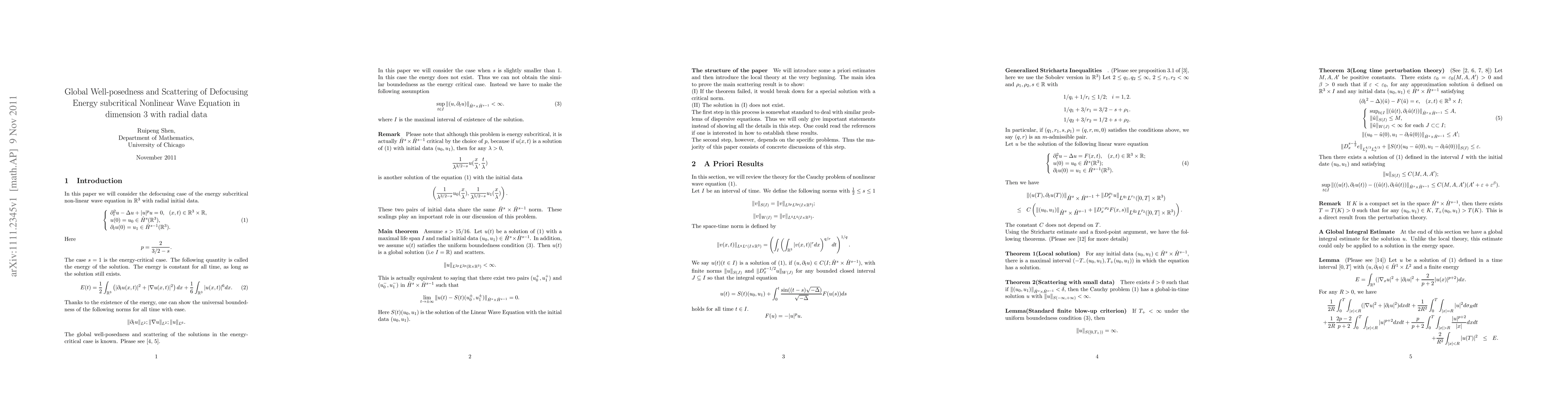 The paper employs a combination of Strichartz estimates, rescaling techniques, and a recursive argument to analyze the global well-posedness and scattering of solutions for the defocusing energy subcritical nonlinear wave equation in three dimensions with radial data.
