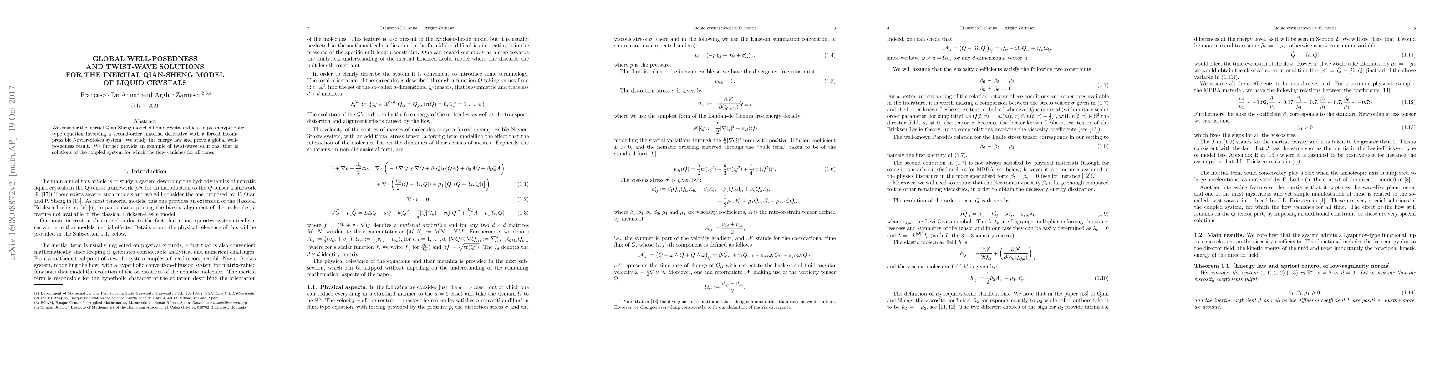 This paper investigates the inertial Qian-Sheng model for liquid crystals, proving global well-posedness and presenting an example of twist-wave solutions where the flow remains zero throughout time. The study combines a hyperbolic-type equation with a forced incompressible Navier-Stokes system.