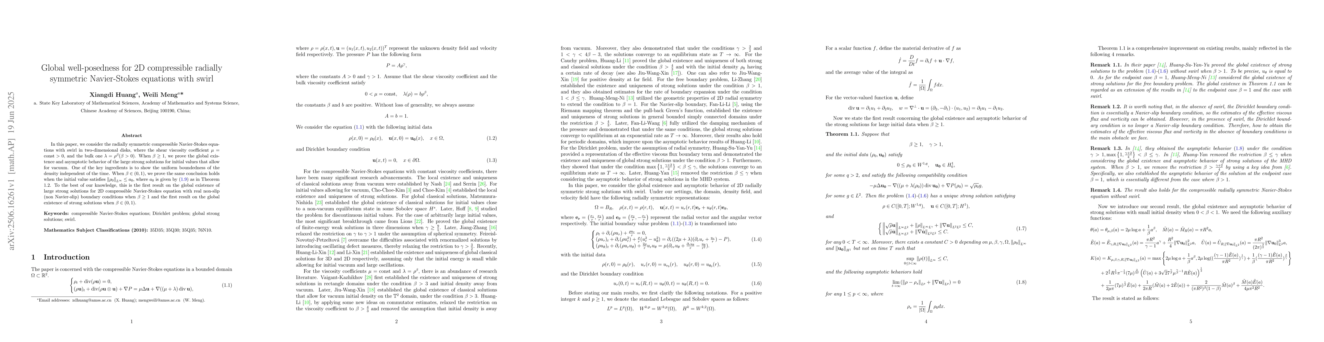 In this paper, we consider the radially symmetric compressible Navier-Stokes equations with swirl in two-dimensional disks, where the shear viscosity coefficient \(\mu = \text{const}> 0\), and the bulk one \(\lambda = \rho^\beta(\beta>0)\). When \(\beta \geq 1\), we prove the global existence and asymptotic behavior of the large strong solutions for initial values that allow for vacuum. One of the key ingredients is to show the uniform boundedness of the density independent of the time. When \(\beta\in(0,1)\), we prove the same conclusion holds when the initial value satisfies \(\norm{\rho_0}_{L^\infty} \leq a_0\), where \(a_0\) is given by \eqref{def a_0} as in Theorem \ref{Thm3}. To the best of our knowledge, this is the first result on the global existence of large strong solutions for 2D compressible Navier-Stokes equation with real non-slip (non Navier-slip) boundary conditions when $\beta\ge1$ and the first result on the global existence of strong solutions when $\beta\in(0,1)$