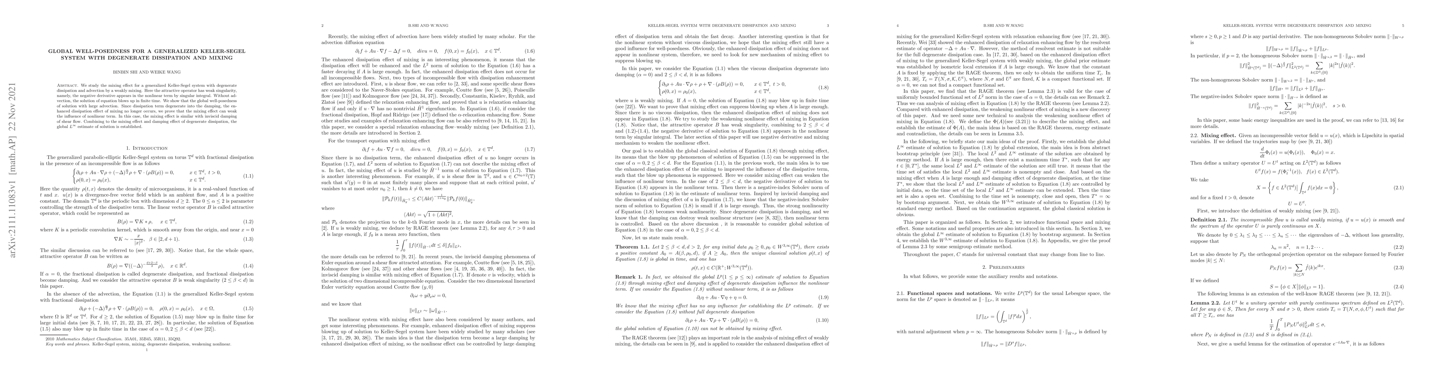 This paper investigates the global well-posedness of a generalized Keller-Segel system with degenerate dissipation and weak mixing. It demonstrates that the mixing effect can mitigate the influence of the nonlinear term, leading to global $L^\infty$ estimates of the solution under large advection conditions.
