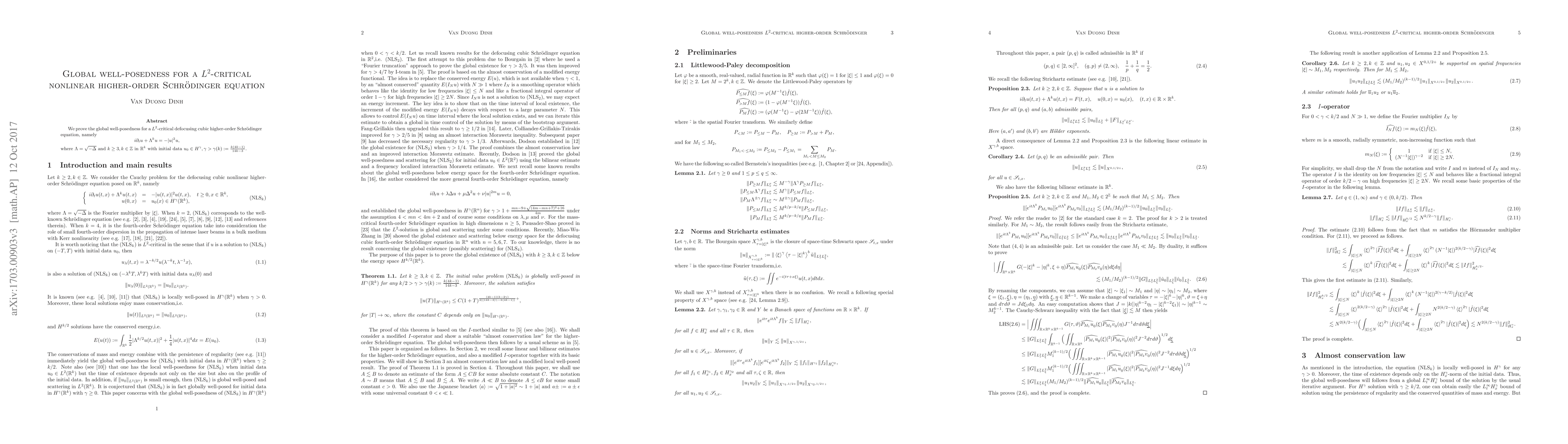This paper proves global well-posedness for a $L^2$-critical defocusing cubic higher-order Schrödinger equation in $\mathbb{R}^k$, where $k \geq 3$ and $\gamma > \gamma(k)$ ensures the initial data condition. The equation involves the Laplacian operator and a nonlinearity of order $|u|^2 u$.