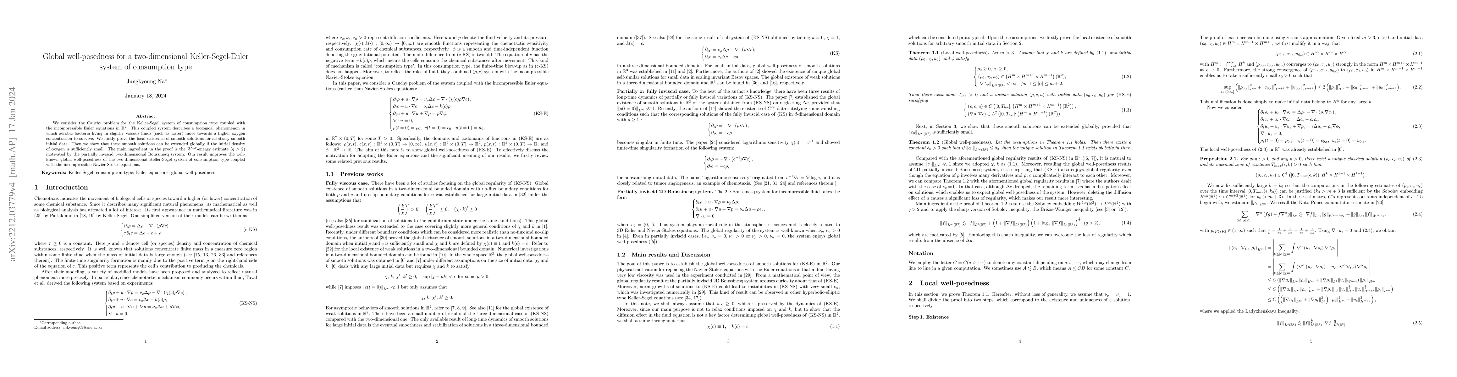We consider the Cauchy problem for the Keller-Segel system of consumption type coupled with the incompressible Euler equations in $\mathbb{R}^2$. This coupled system describes a biological phenomenon in which aerobic bacteria living in slightly viscous fluids (such as water) move towards a higher oxygen concentration to survive. We firstly prove the local existence of smooth solutions for arbitrary smooth initial data. Then we show that these smooth solutions can be extended globally if the initial density of oxygen is sufficiently small. The main ingredient in the proof is the $W^{1,q}$-energy estimate $(q>2)$ motivated by the partially inviscid two-dimensional Boussinesq system in \cite{C06}. Our result improves the well-known global well-posedness of the two-dimensional Keller-Segel system of consumption type coupled with the incompressible Navier-Stokes equations.