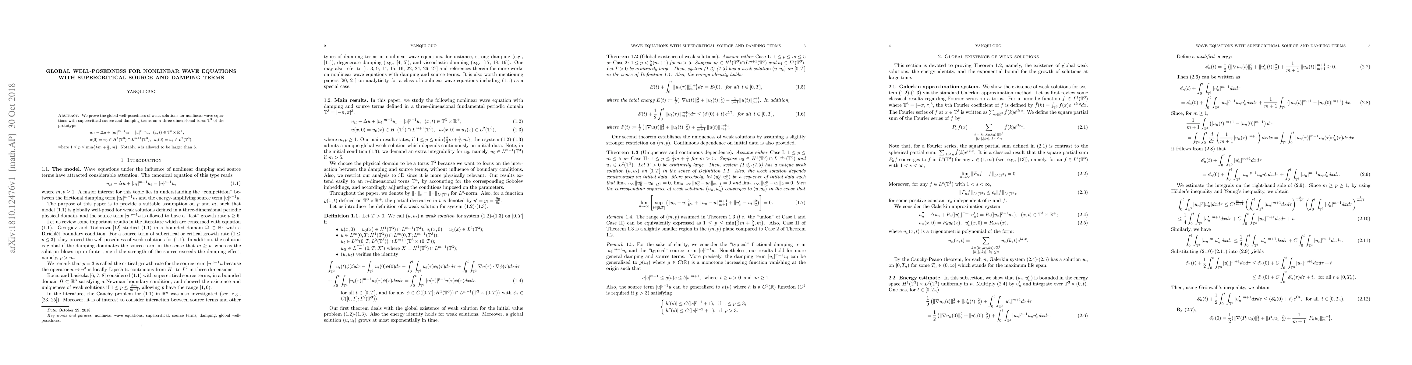 This paper establishes global well-posedness for weak solutions of nonlinear wave equations featuring supercritical source and damping terms on a three-dimensional torus. The specific equation considered allows for source term exponents larger than typical supercritical cases.