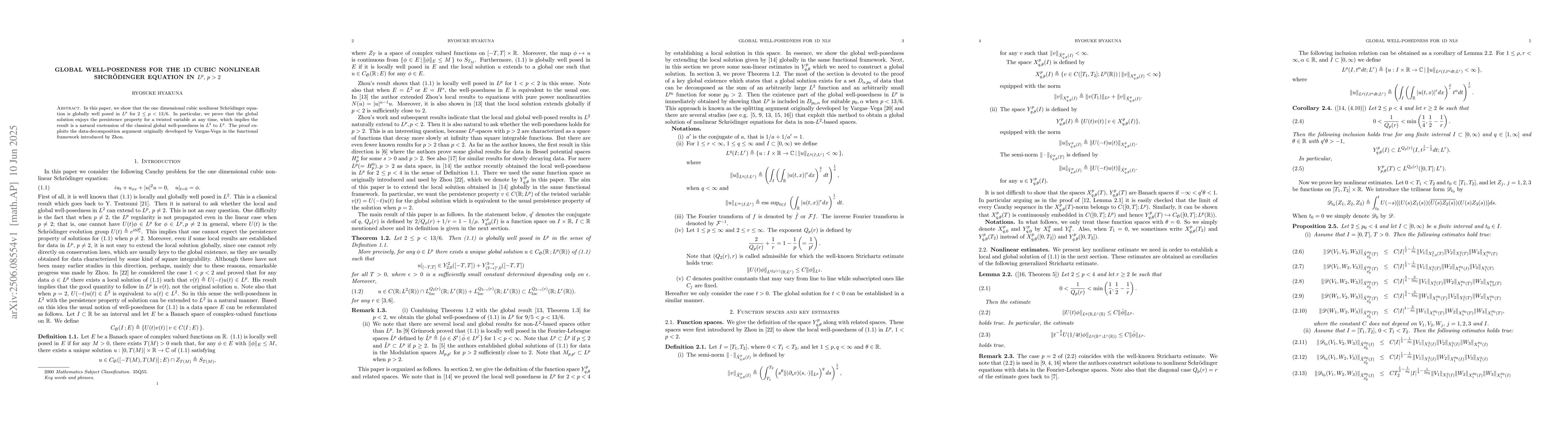 The one-dimensional cubic nonlinear Schrödinger equation is globally well-posed in L^p for 2 ≤ p < 13/6, extending the classical result to higher L^p spaces.