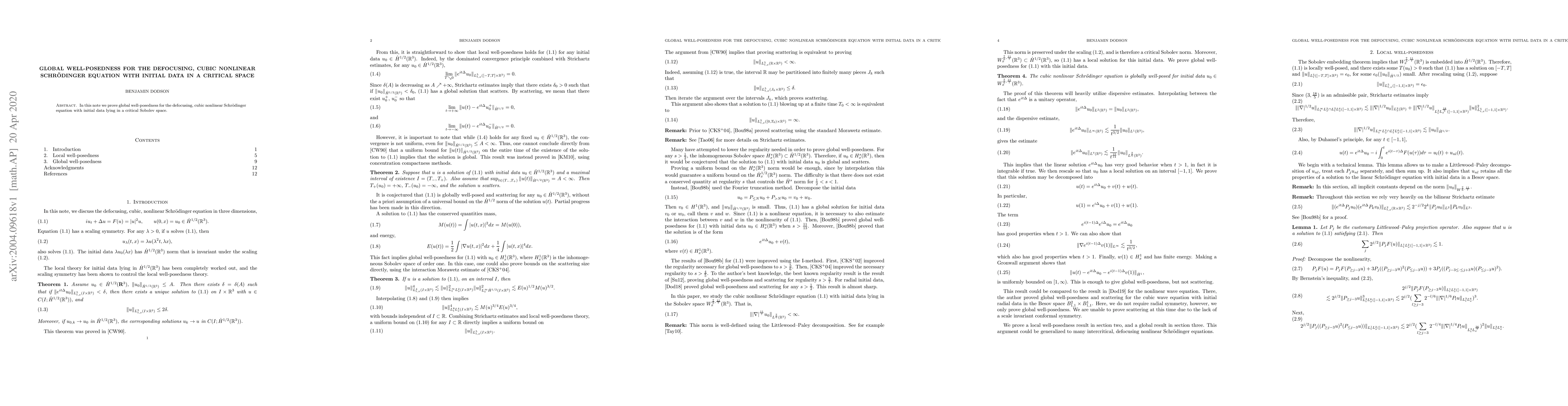 Summary: This paper establishes global well-posedness for the defocusing, cubic nonlinear Schrödinger equation when initial data is within a critical Sobolev space. The authors provide a rigorous proof of the solution's existence and continuity over the entire time domain.