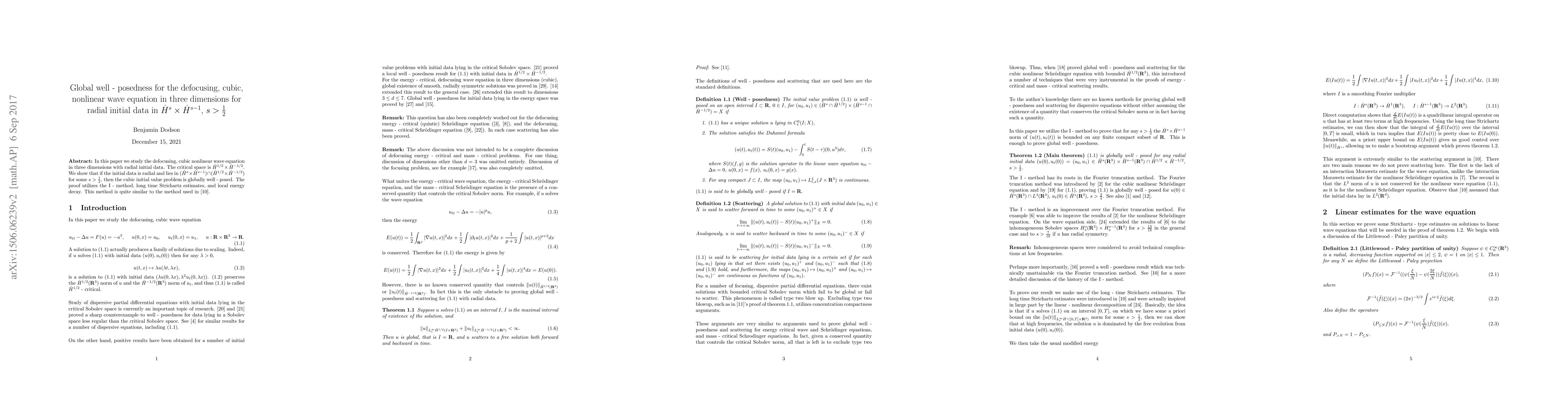 In this paper we study the defocusing, cubic nonlinear wave equation in three dimensions with radial initial data. The critical space is $\dot{H}^{1/2} \times \dot{H}^{-1/2}$. We show that if the initial data is radial and lies in $(\dot{H}^{s} \times \dot{H}^{s - 1}) \cap (\dot{H}^{1/2} \times \dot{H}^{-1/2})$ for some $s > \frac{1}{2}$, then the cubic initial value problem is globally well - posed. We use the I - method and the long time Strichartz estimates. This method is quite similar to the method used in [D2].
