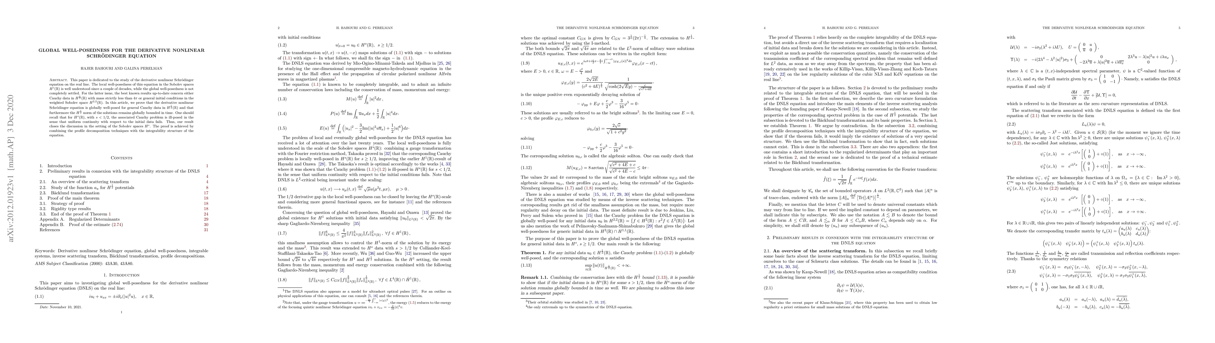 This paper is dedicated to the study of the derivative nonlinear Schr\"odinger equation on the real line. The local well-posedness of this equation in the Sobolev spaces is well understood since a couple of decades, while the global well-posedness is not completely settled. For the latter issue, the best known results up-to-date concern either Cauchy data in $H^{\frac12}$ with mass strictly less than $4\pi$ or general initial conditions in the weighted Sobolev space $H^{2, 2}$. In this article, we prove that the derivative nonlinear Schr\"odinger equation is globally well-posed for general Cauchy data in $H^{\frac12}$ and that furthermore the $H^{\frac12}$ norm of the solutions remains globally bounded in time. One should recall that for $H^s$, with $s < 1 / 2 $, the associated Cauchy problem is ill-posed in the sense that uniform continuity with respect to the initial data fails. Thus, our result closes the discussion in the setting of the Sobolev spaces $H^s$. The proof is achieved by combining the profile decomposition techniques with the integrability structure of the equation.