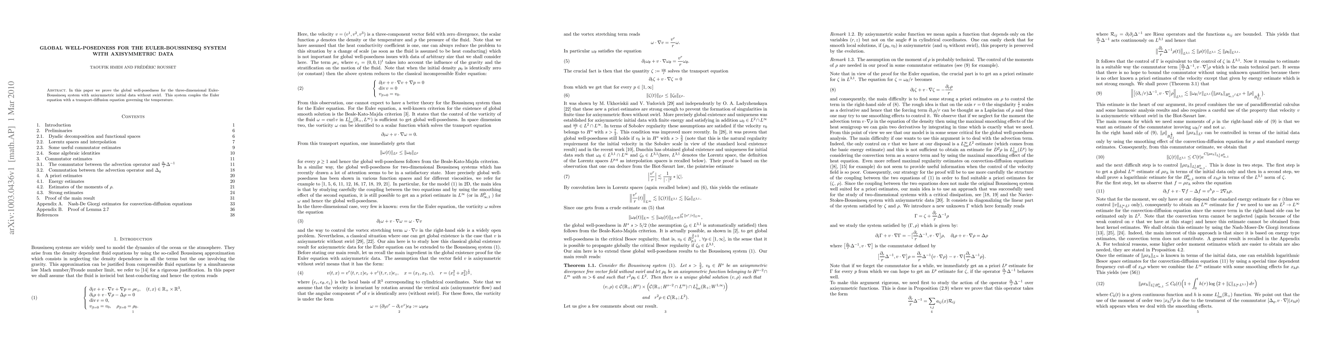 Summary: This paper establishes global well-posedness for the three-dimensional Euler-Boussinesq system with axisymmetric initial data, focusing on configurations without swirl and coupling the Euler equation with a temperature transport-diffusion equation.