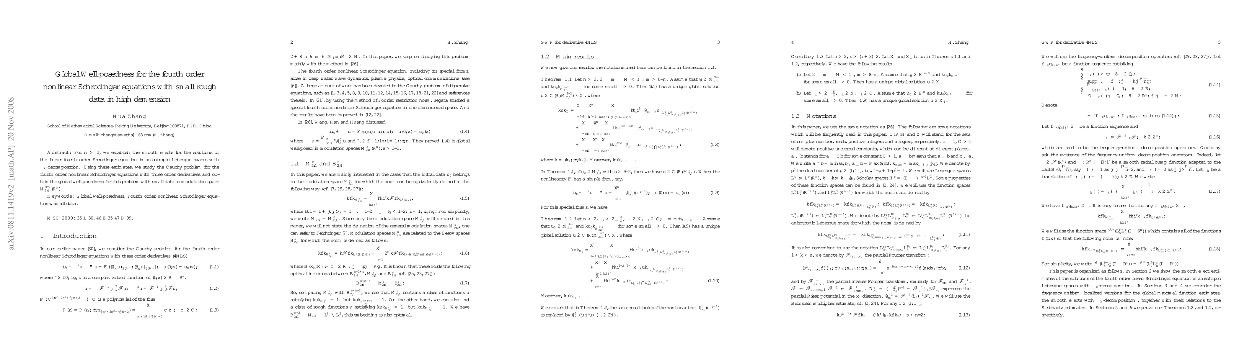 This paper establishes global well-posedness for fourth-order nonlinear Schrödinger equations with small rough initial data in high dimensions. It leverages smooth effects from linear fourth-order Schrödinger equations in anisotropic Lebesgue spaces and uses modulation space estimates to achieve the result.