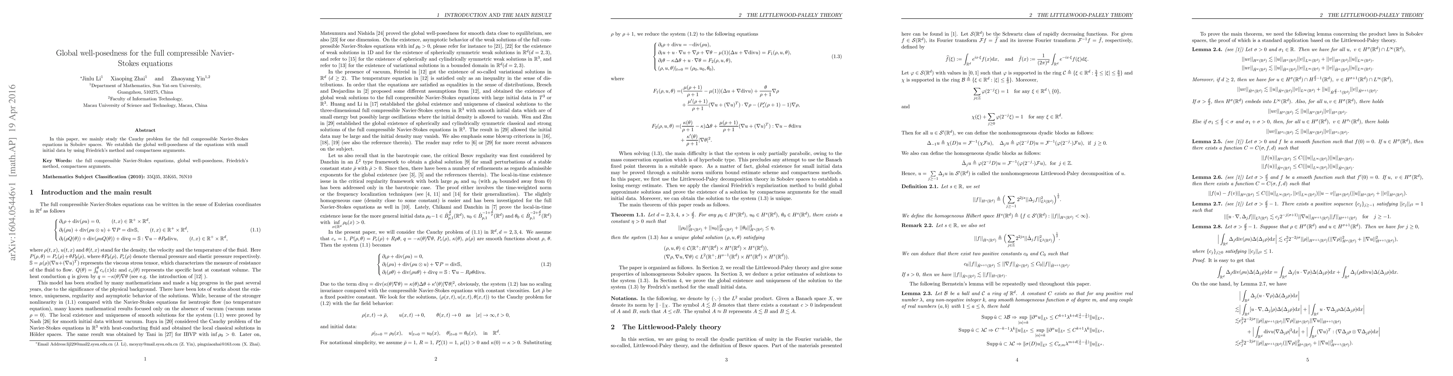 Summary: This paper establishes global well-posedness for the full compressible Navier-Stokes equations with small initial data in Sobolev spaces, utilizing Friedrich's method and compactness arguments. The authors resolve the Cauchy problem for these equations.