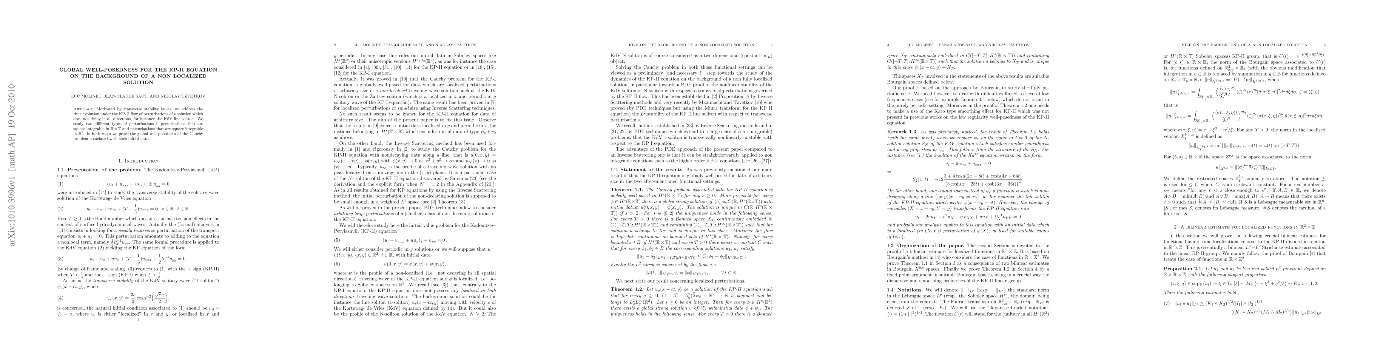 Motivated by transverse stability issues, we address the time evolution under the KP-II flow of perturbations of a solution which does not decay in all directions, for instance the KdV-line soliton. We study two different types of perturbations : perturbations that are square integrable in $ \R\times \T $ and perturbations that are square integrable in $ \R^2 $. In both cases we prove the global well-posedness of the Cauchy problem associated with such initial data.