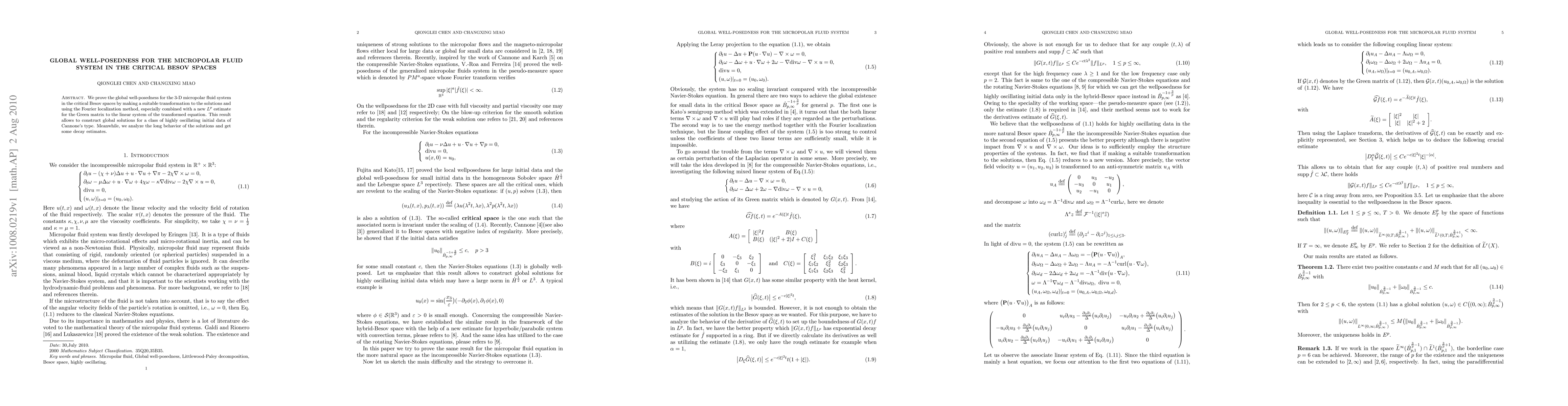 Summary: This paper proves global well-posedness for the 3-D micropolar fluid system in critical Besov spaces using a transformation and Fourier localization, along with a new $L^p$ estimate for the Green matrix. It constructs global solutions for highly oscillating initial data and provides decay estimates for the long-term behavior of solutions.