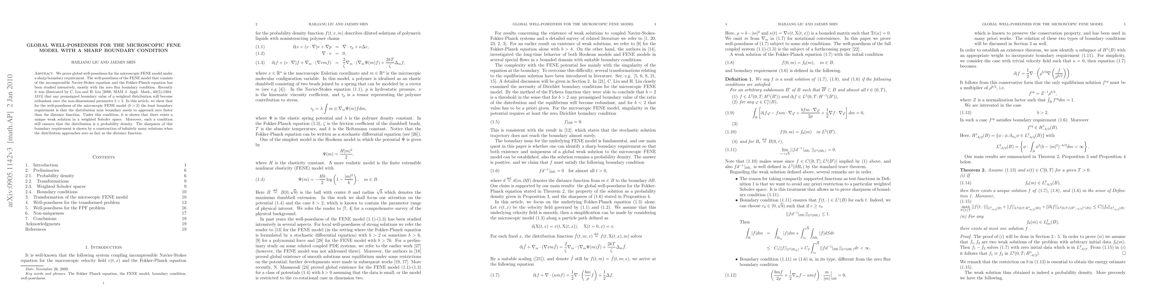 This paper proves global well-posedness for the microscopic FENE model under a boundary condition requiring the distribution to approach zero faster than the distance function. It demonstrates the existence of a unique weak solution in a weighted Sobolev space, ensuring the distribution remains a probability density.