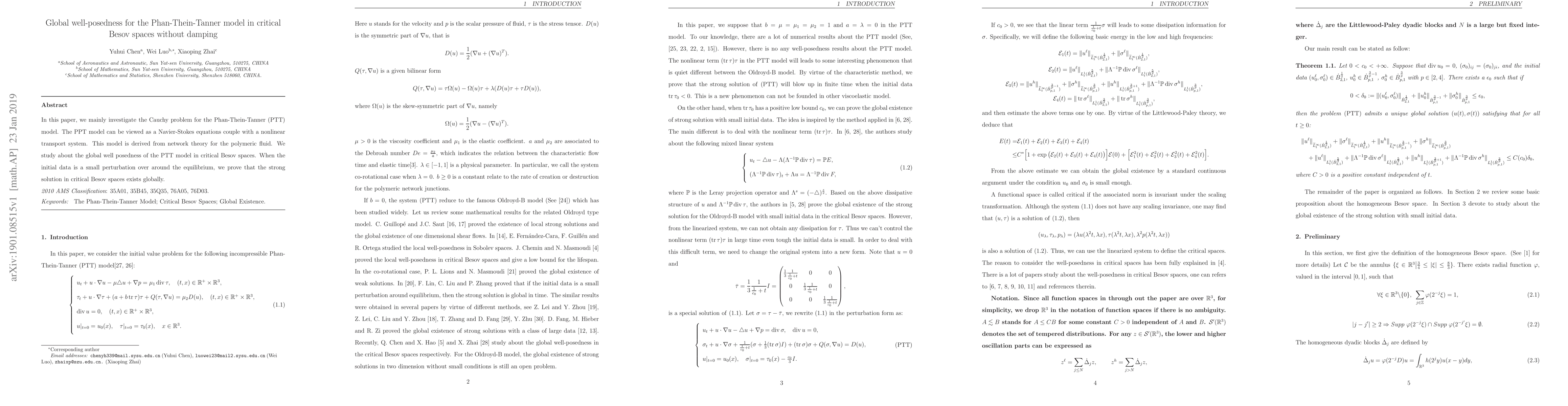This paper investigates the global well-posedness of the Phan-Thein-Tanner (PTT) model in critical Besov spaces without damping. It proves the existence of a global strong solution when initial data is a small perturbation around equilibrium.
