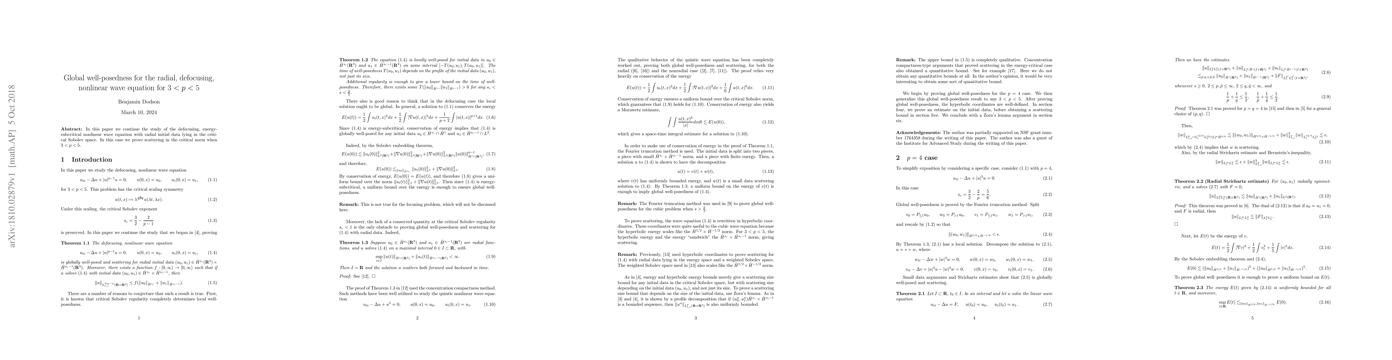 Summary: This paper proves global well-posedness and scattering for the radial, defocusing, nonlinear wave equation with initial data in the critical Sobolev space when the exponent $3 < p < 5$. The results extend the understanding of energy-subcritical nonlinear wave equations.