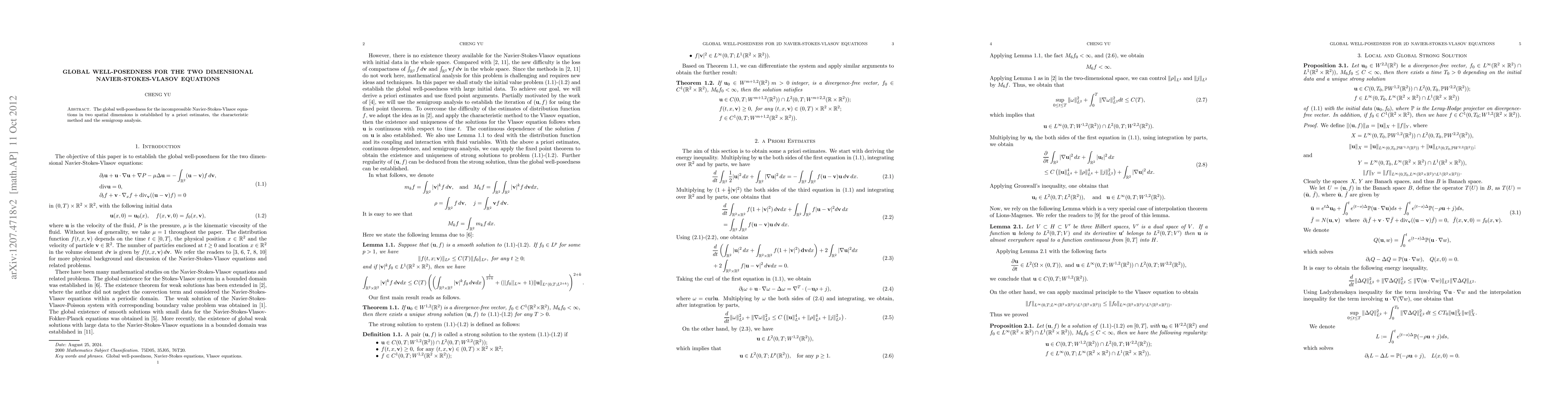 Summary: This paper establishes global well-posedness for the two-dimensional incompressible Navier-Stokes-Vlasov equations using a combination of a priori estimates, the characteristic method, and semigroup analysis. The approach ensures the existence and uniqueness of solutions over the entire time domain.