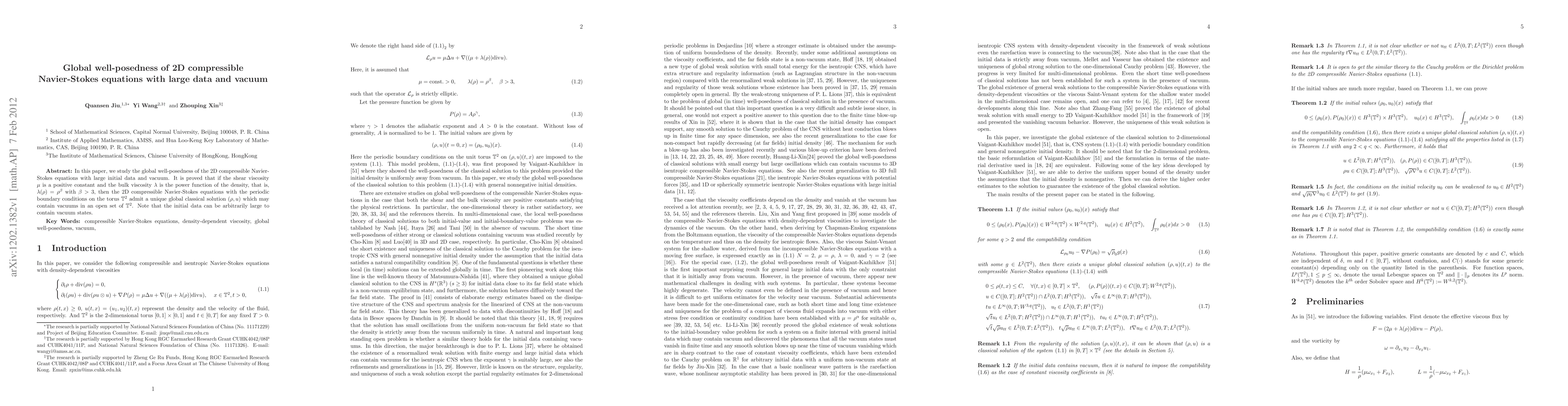 This paper proves global well-posedness for 2D compressible Navier-Stokes equations with large initial data and vacuum states. It establishes the existence of a unique global classical solution under specific conditions on viscosity and density.