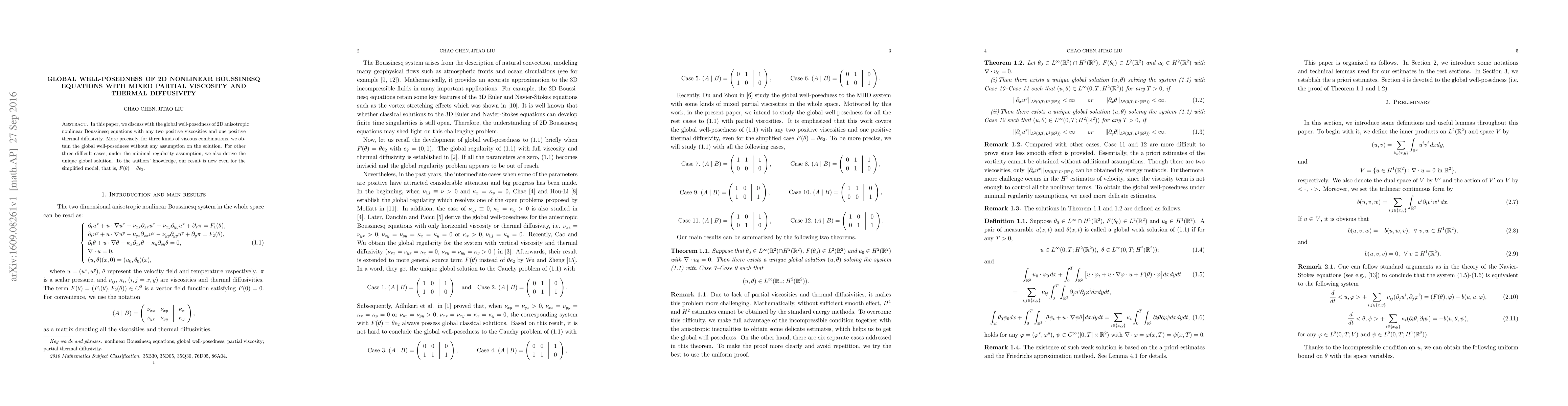 This paper establishes global well-posedness for 2D nonlinear Boussinesq equations with mixed viscosities and thermal diffusivity, proving solutions exist globally without assumptions for certain combinations and under minimal regularity for others. The findings are novel even for simplified models.