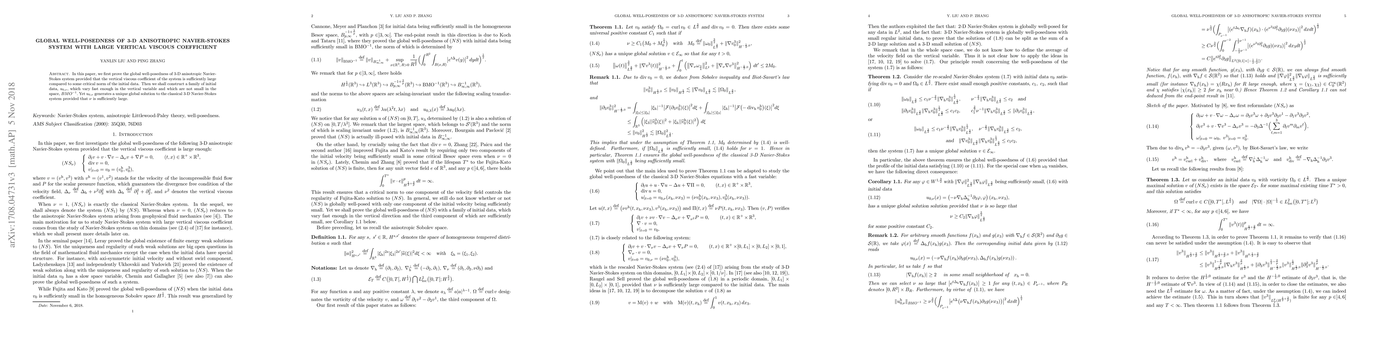 In this paper, we first prove the global well-posedness of 3-D anisotropic Navier-Stokes system provided that the vertical viscous coefficient of the system is sufficiently large compared to some critical norm of the initial data. Then we shall construct a family of initial data, $u_{0,\nu},$ which vary fast enough in the vertical variable and which are not small in the space, $BMO^{-1}.$ Yet $u_{0,\nu}$ generates a unique global solution to the classical 3-D Navier-Stokes system provided that $\nu$ is sufficiently large.