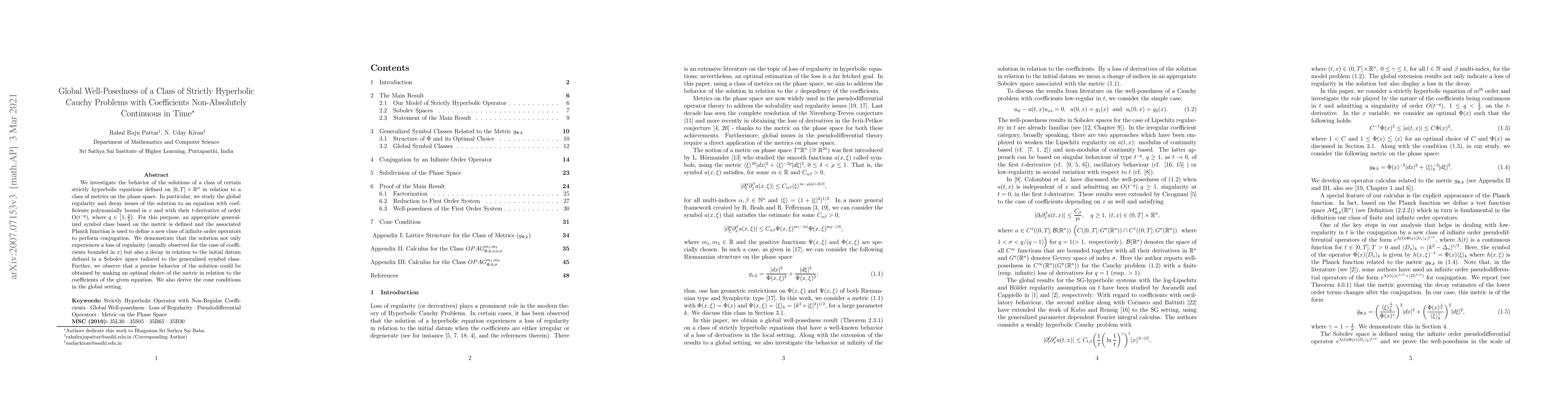 We investigate the behavior of the solutions of a class of certain strictly hyperbolic equations defined on $[0,T]\times \R^n$ in relation to a class of metrics on the phase space. In particular, we study the global regularity and decay issues of the solution to an equation with coefficients polynomially bound in $x$ and with their $t$-derivative of order $\textnormal{O}(t^{-q}),$ where $q \in \big[1,\frac{3}{2}\big)$. For this purpose, an appropriate generalized symbol class based on the metric is defined and the associated Planck function is used to define an infinite order operator to perform conjugation. We demonstrate that the solution not only experiences a loss of regularity (usually observed for the case of coefficients bounded in $x$) but also a decay in relation to the initial datum defined in a Sobolev space tailored to the generalized symbol class. Further, we observe that a precise behavior of the solution could be obtained by making an optimal choice of the metric in relation to the coefficients of the given equation. We also derive the cone conditions in the global setting.