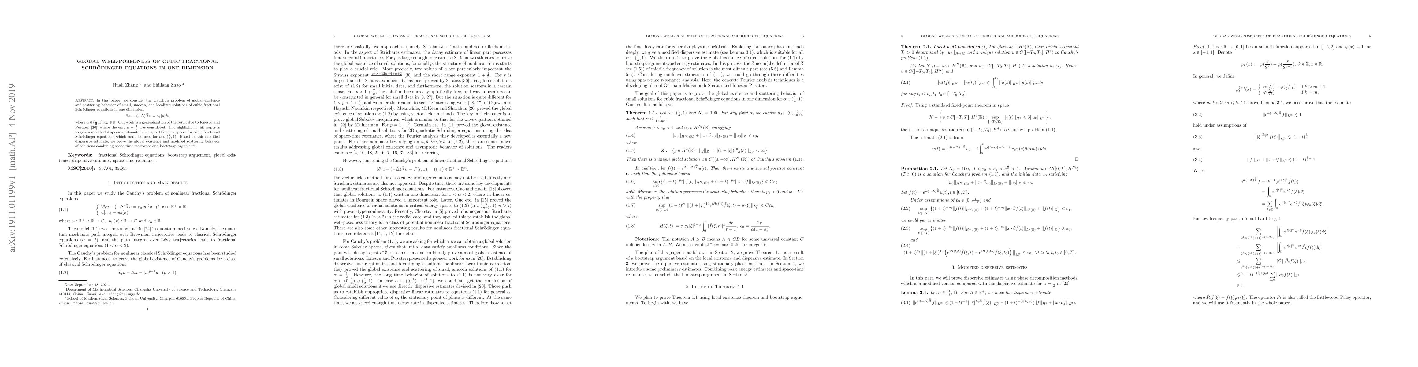 This paper investigates the global well-posedness of cubic fractional Schrödinger equations in one dimension, proving global existence and scattering for small, smooth, and localized solutions. The key contribution is a modified dispersive estimate in weighted Sobolev spaces, which enables the analysis for $\alpha \in (\frac{1}{3},1)$.
