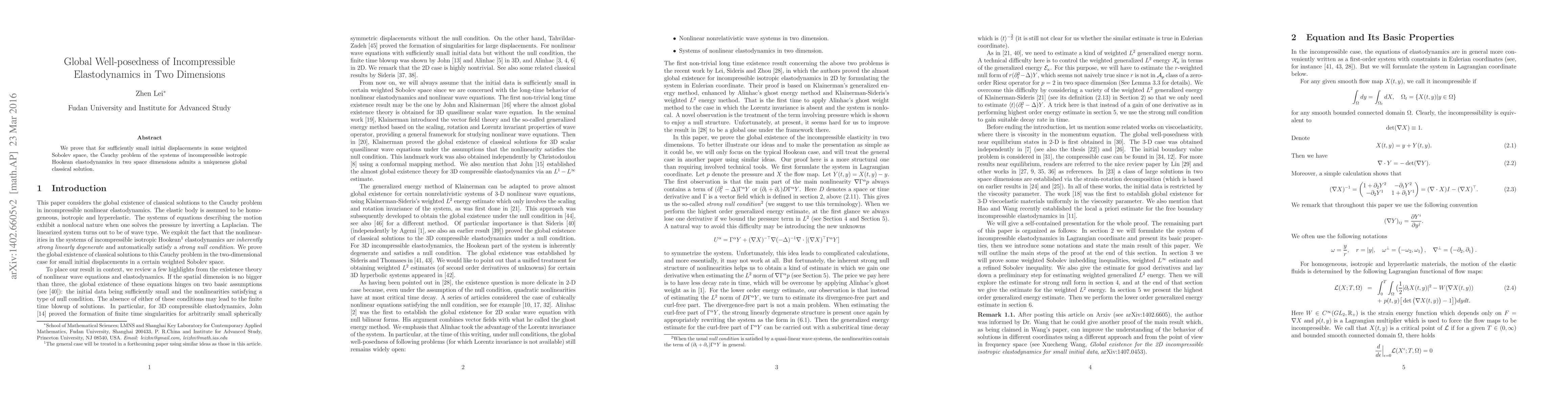 Summary: This paper establishes global well-posedness for the Cauchy problem of incompressible isotropic elastodynamics in two dimensions, proving uniqueness and existence of a classical solution for small initial displacements in a specified weighted Sobolev space.