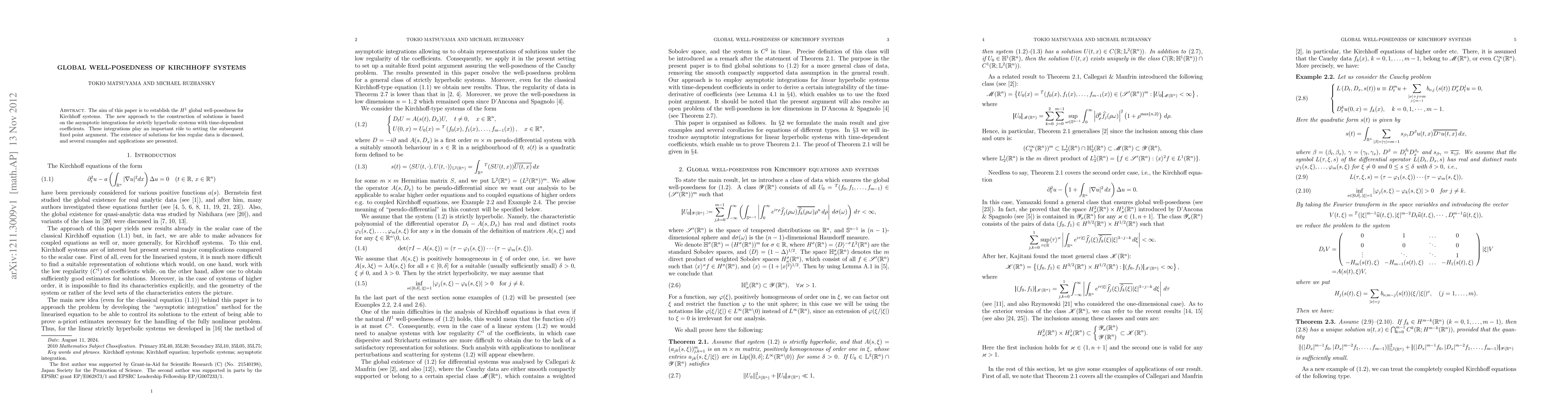 This paper establishes H^1 global well-posedness for Kirchhoff systems using asymptotic integrations, enabling solutions for less regular data with various applications.
