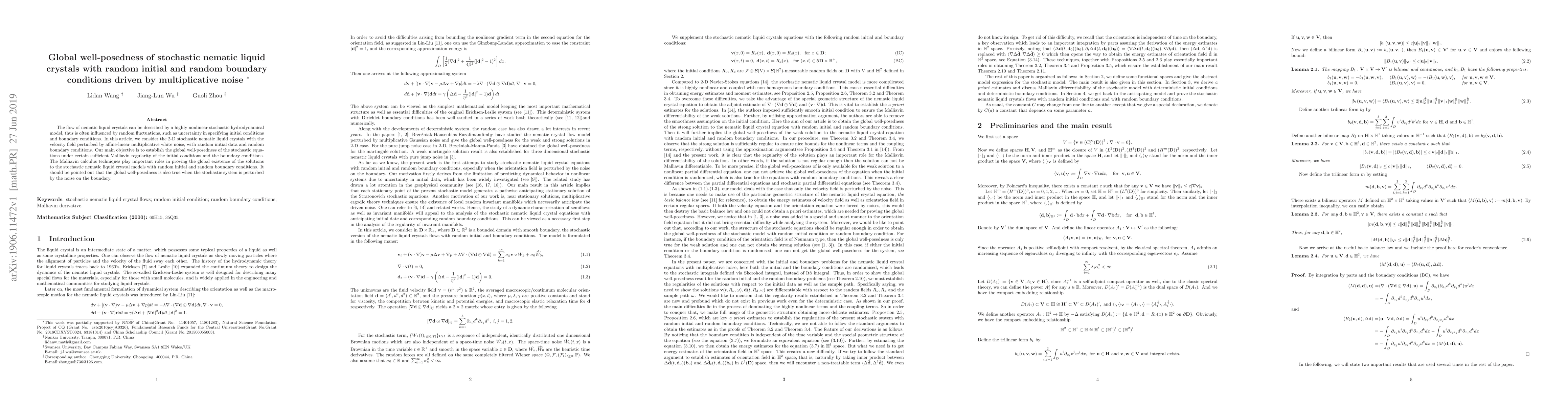 This paper investigates the global well-posedness of a stochastic model for 2D nematic liquid crystals, considering random initial and boundary conditions driven by multiplicative noise. The authors utilize Malliavin calculus techniques to establish the existence of solutions under sufficient regularity conditions, demonstrating global well-posedness even with noise on the boundary.