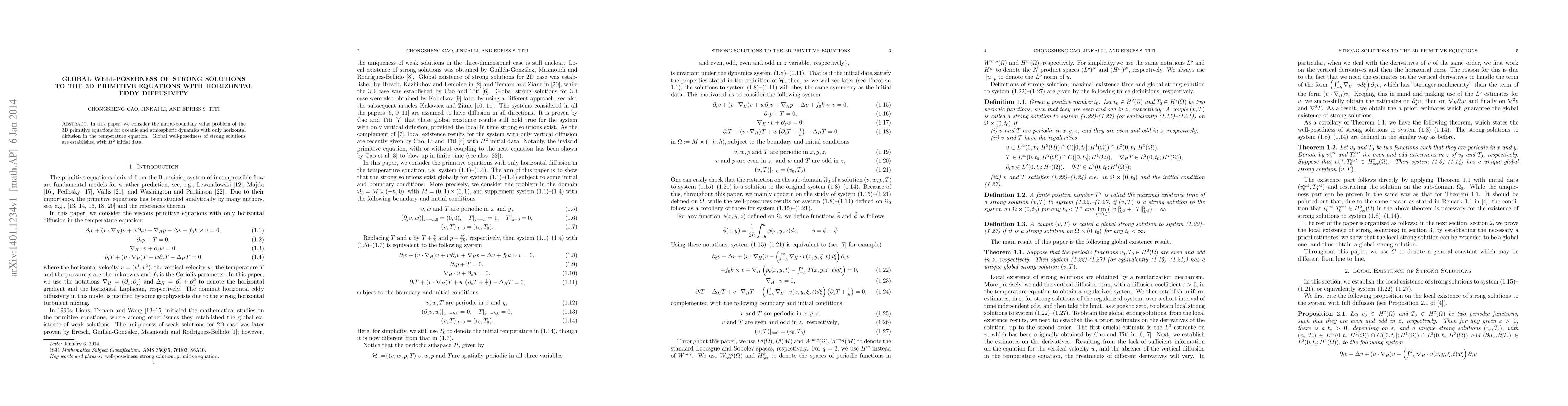 The paper establishes global well-posedness of strong solutions for the 3D primitive equations incorporating horizontal eddy diffusivity, proving results for initial data in the $H^2$ function space. This work focuses on oceanic and atmospheric dynamics with horizontal diffusion in the temperature equation.