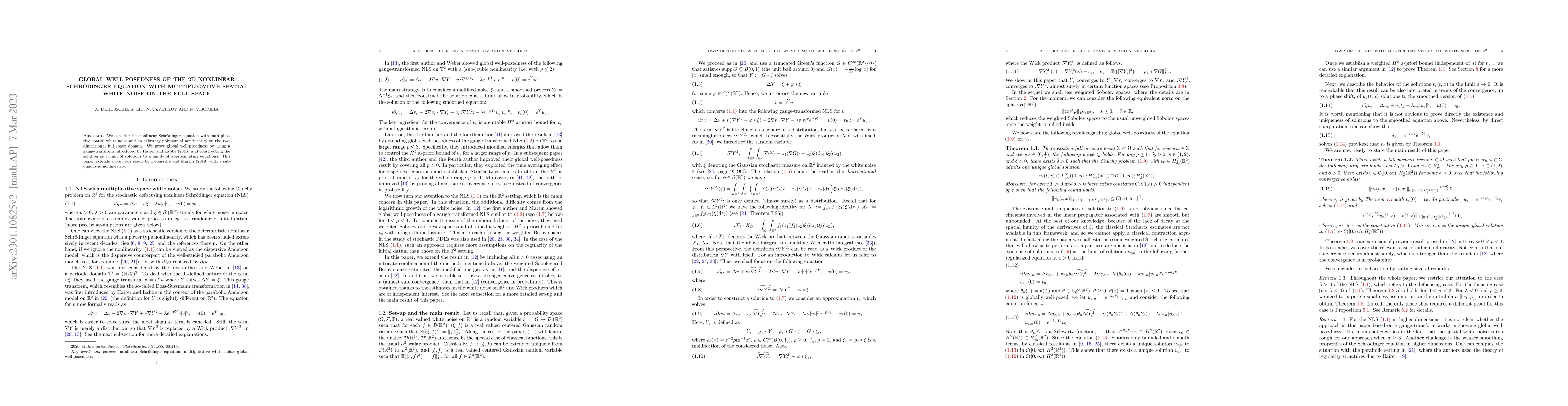This paper proves global well-posedness for the 2D nonlinear Schrödinger equation with multiplicative spatial white noise and polynomial nonlinearity, using a gauge-transform and a limit construction method. It extends previous results by handling a broader range of nonlinearities.