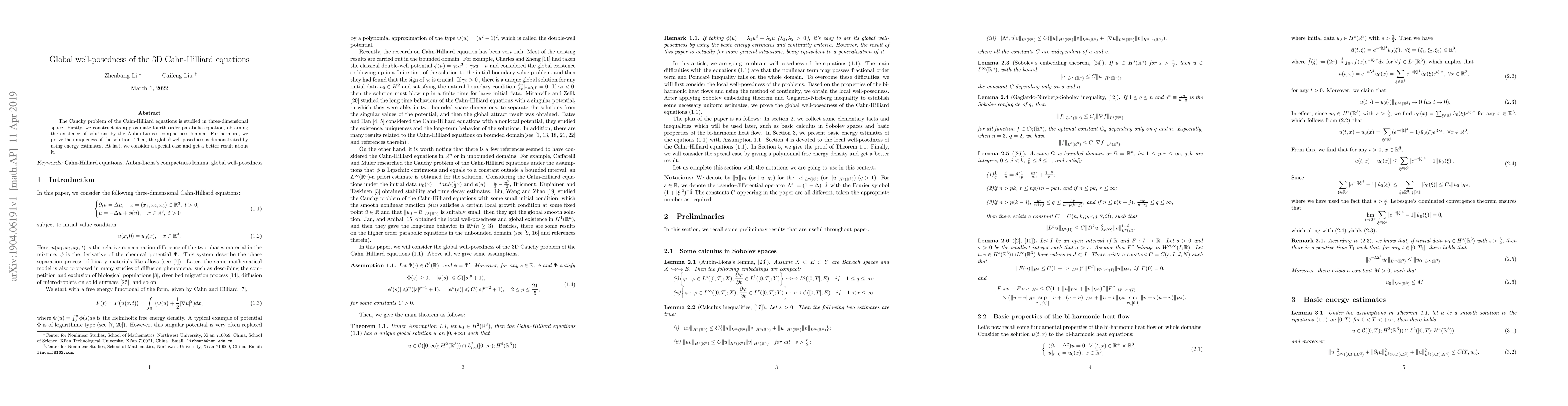 This paper investigates the global well-posedness of the 3D Cahn-Hilliard equations, proving existence and uniqueness of solutions through energy estimates and demonstrating global well-posedness.