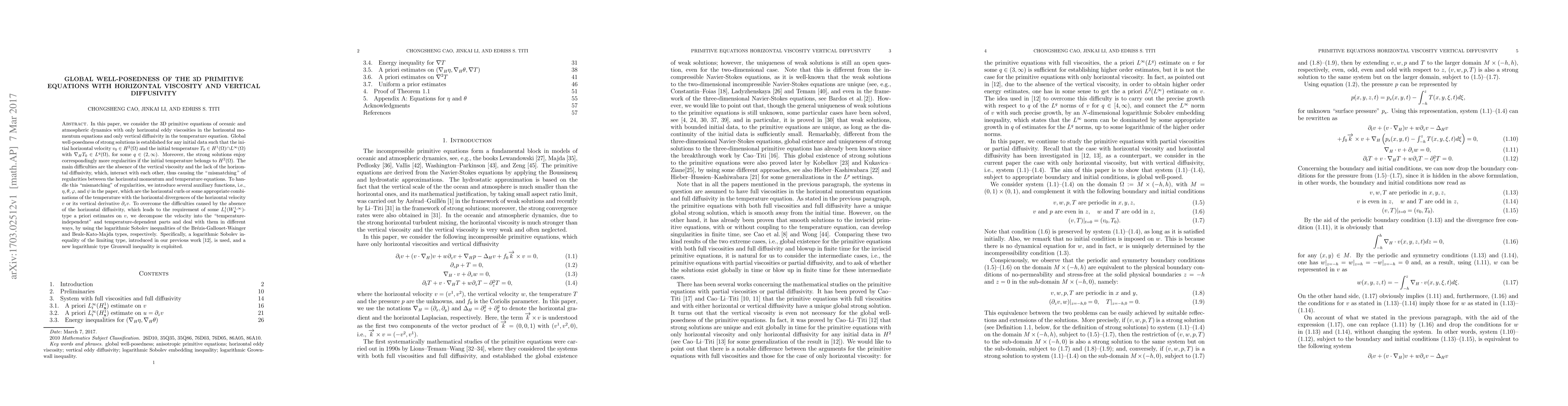 This paper establishes global well-posedness for strong solutions of the 3D primitive equations with horizontal viscosity and vertical diffusivity, given specific initial conditions. The authors address the "mismatching" of regularities between horizontal momentum and temperature equations by introducing auxiliary functions and decomposing the velocity into temperature-independent and temperature-dependent parts, utilizing advanced inequalities.