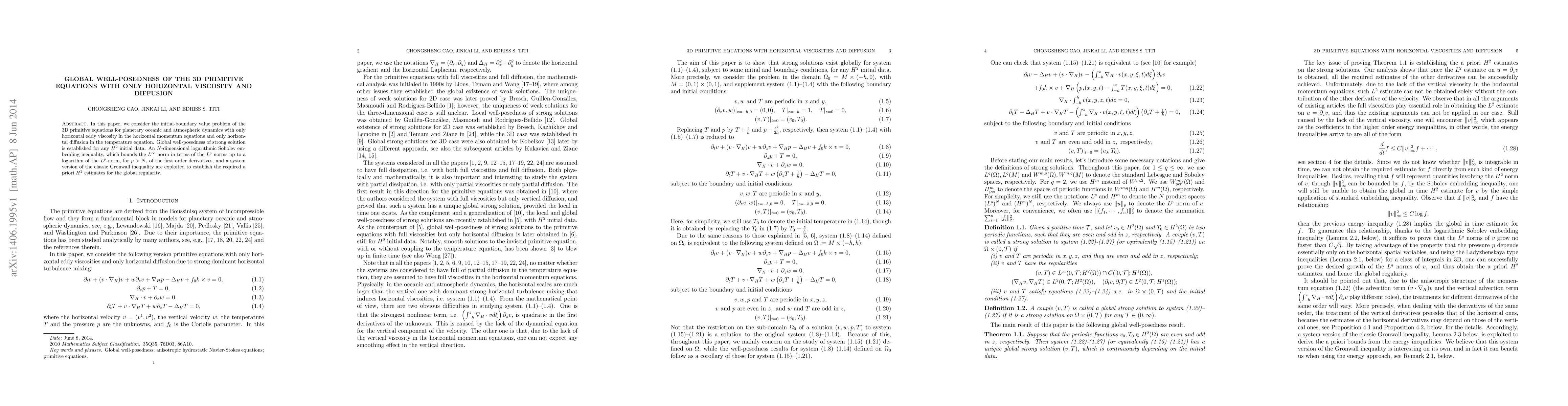 This paper establishes global well-posedness for strong solutions of the 3D primitive equations with horizontal viscosity and diffusion, using $H^2$ initial data. It leverages an $N$-dimensional logarithmic Sobolev embedding inequality and a system version of the Gronwall inequality to achieve the necessary $H^2$ a priori estimates for global regularity.