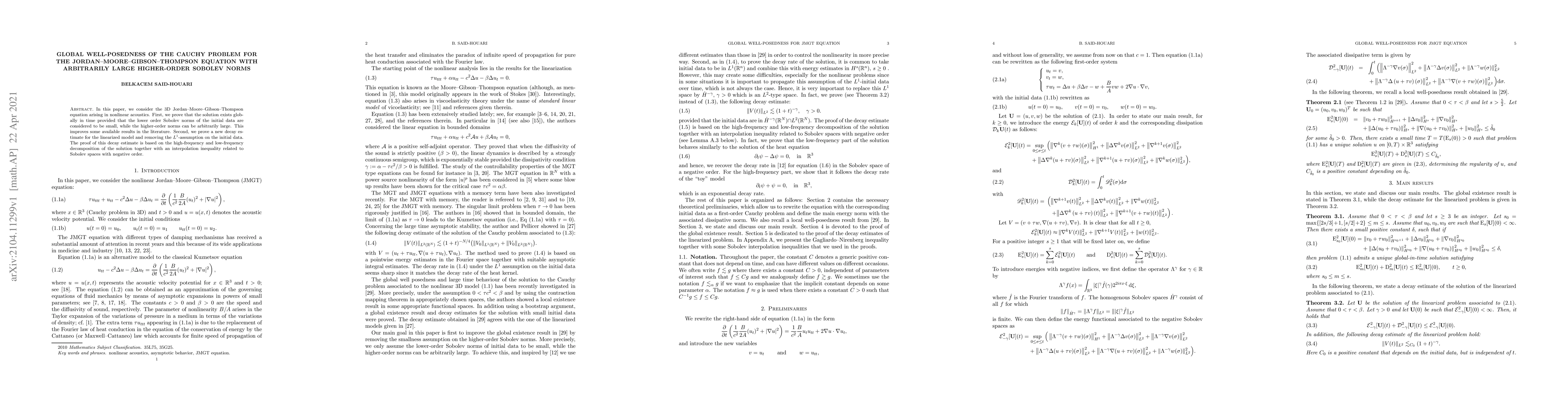 This paper establishes global well-posedness for the 3D Jordan-Moore-Gibson-Thompson equation in nonlinear acoustics, proving existence of global solutions with small lower-order but arbitrarily large higher-order Sobolev norms, and introduces a new decay estimate for the linearized model without the $L^1$-initial data assumption.