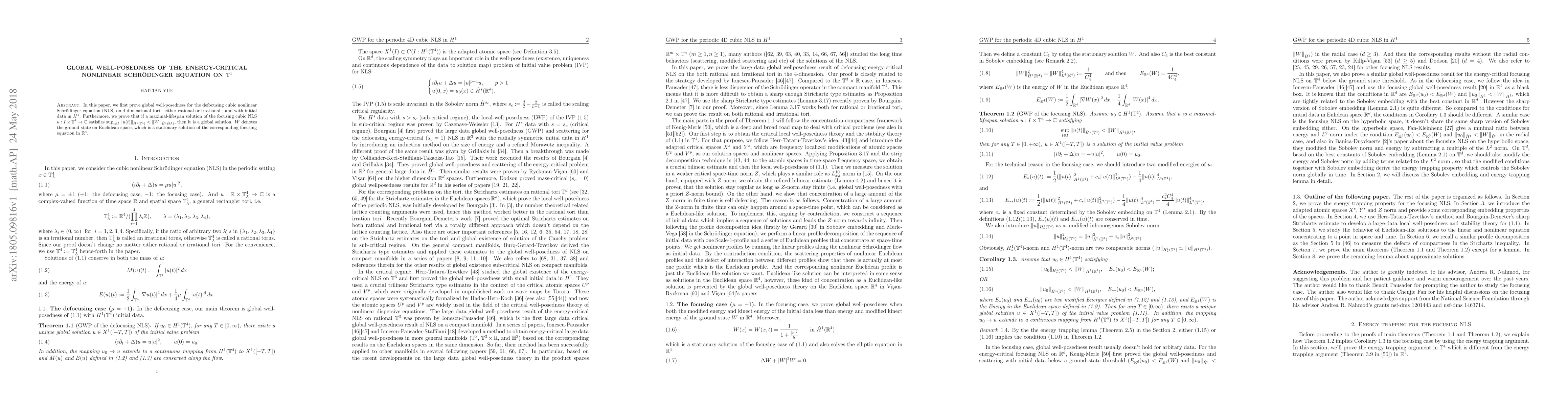 This paper establishes global well-posedness for the defocusing cubic nonlinear Schrödinger equation on 4-dimensional tori, proving that initial data in $H^1$ guarantees existence. It also shows that solutions to the focusing cubic NLS are global if they do not exceed the $\dot{H}^1$ norm of the ground state on Euclidean space.
