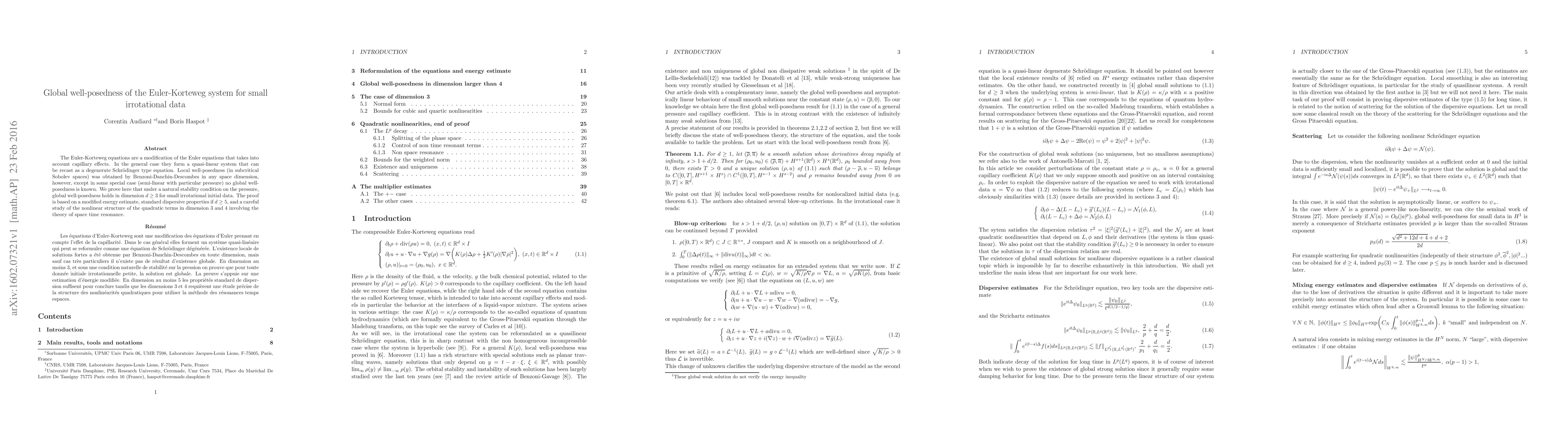 The Euler-Korteweg equations are a modification of the Euler equations that takes into account capillary effects. In the general case they form a quasi-linear system that can be recast as a degenerate Schr\"odinger type equation. Local well-posedness (in subcritical Sobolev spaces) was obtained by Benzoni-Danchin-Descombes in any space dimension, however, except in some special case (semi-linear with particular pressure) no global well-posedness is known. We prove here that under a natural stability condition on the pressure, global well-posedness holds in dimension $d\geq 3$ for small irrotational initial data. The proof is based on a modified energy estimate, standard dispersive properties if $d\geq 5$, and a careful study of the nonlinear structure of the quadratic terms in dimension $3$ and $4$ involving the theory of space time resonance.
